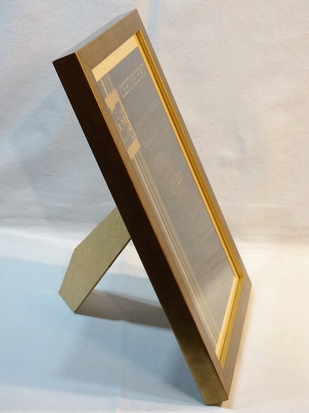 Blaszka bądź laminat umieszczone są za szklaną szybką w drewnianej malowanej na złoty kolor ramie.