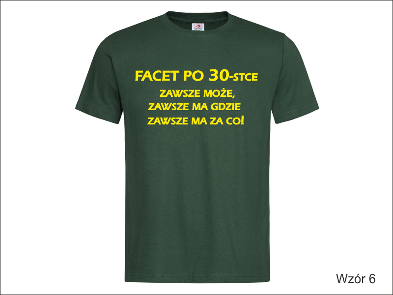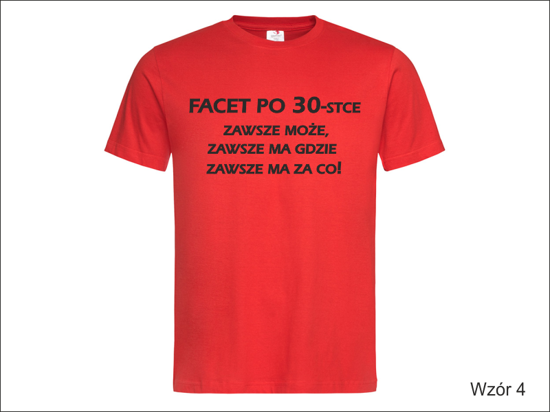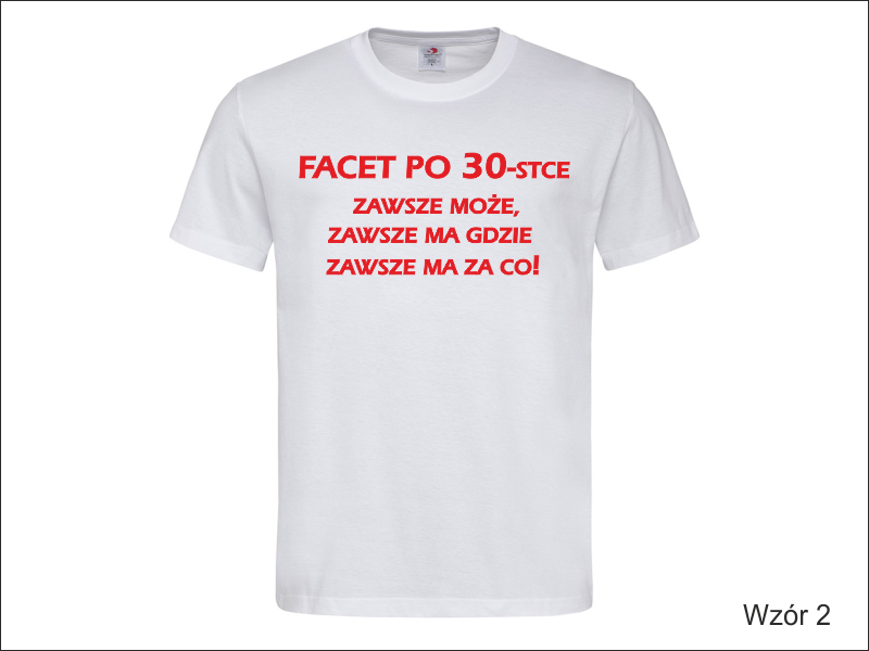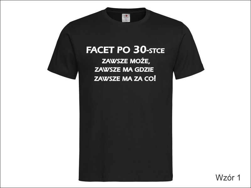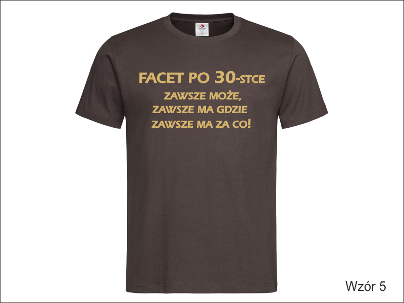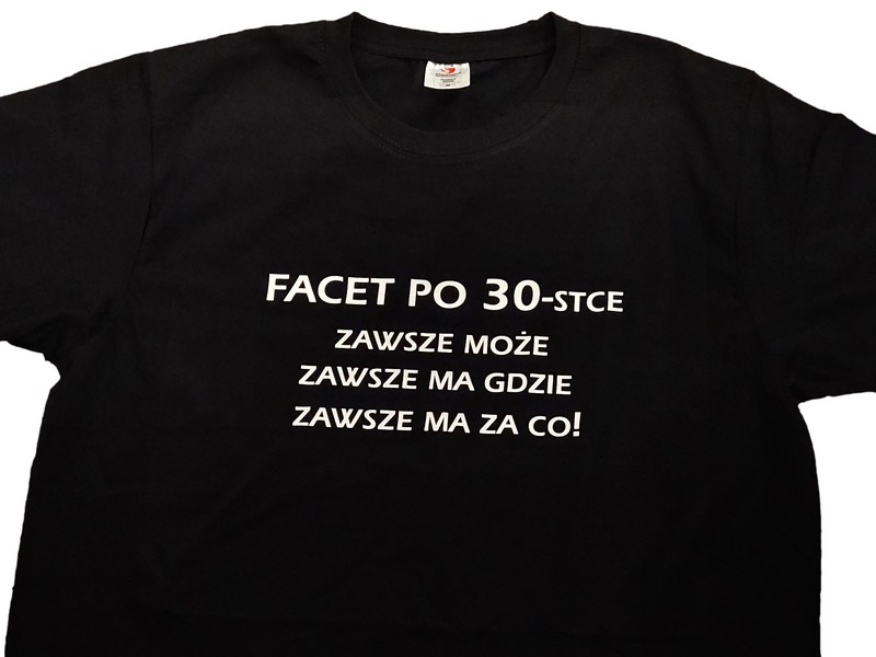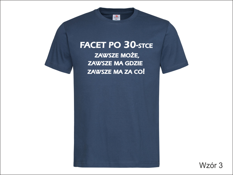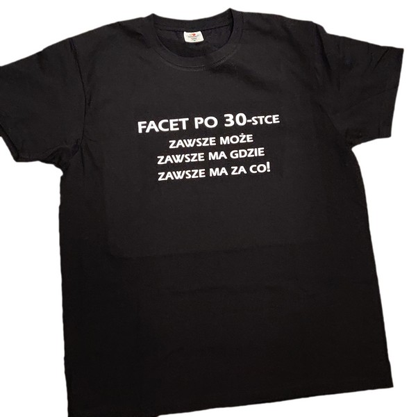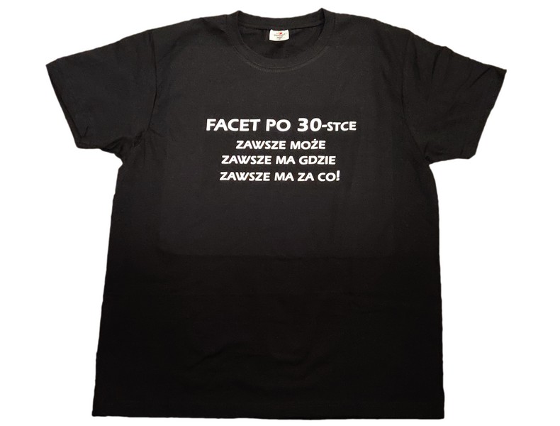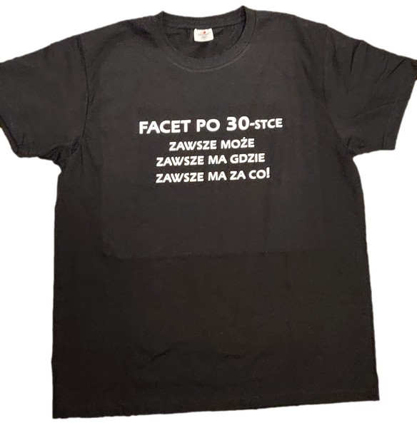 Urodzinowa koszulka męska z nadrukowaną z przodu grafiką i napisem "Facet po... zawsze może, zawsze ma gdzie, zawsze ma za co".