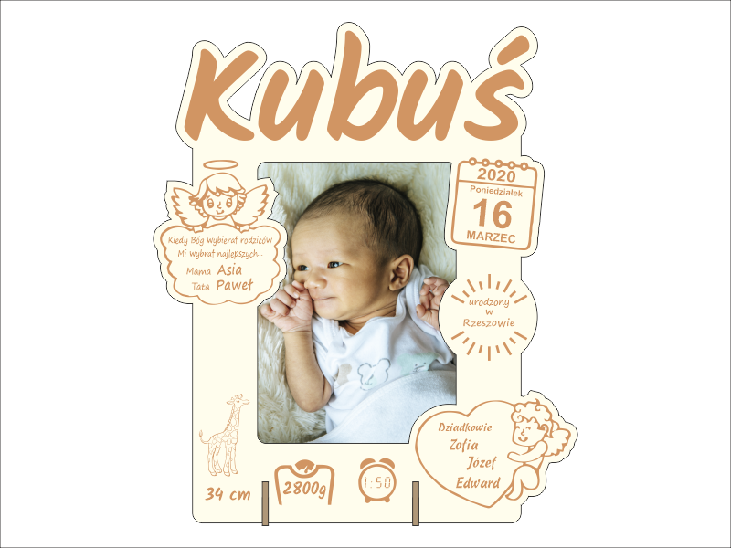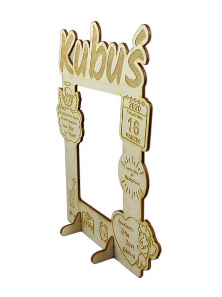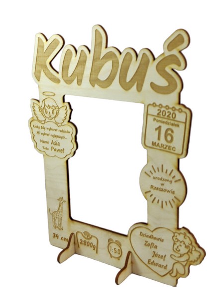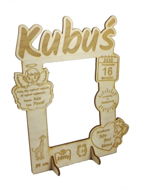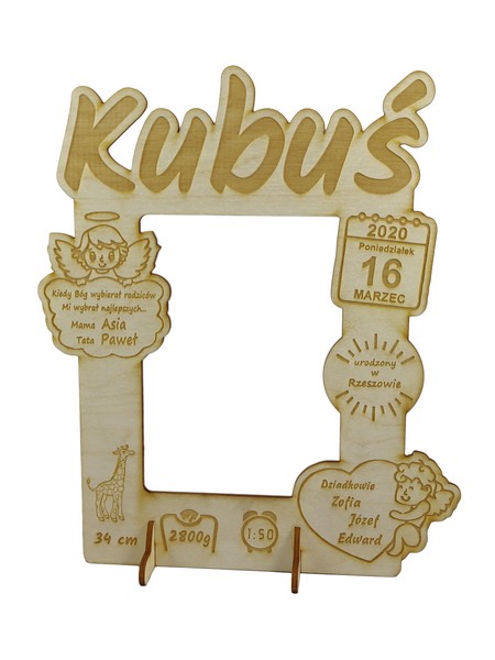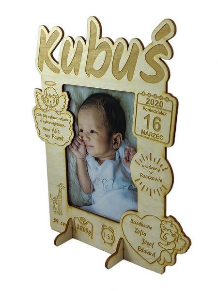 Ramka ma kształt prostokąta z umieszczonym na około grawerunkiem różnych informacji związanych z nowonarodzonym dzieckiem.