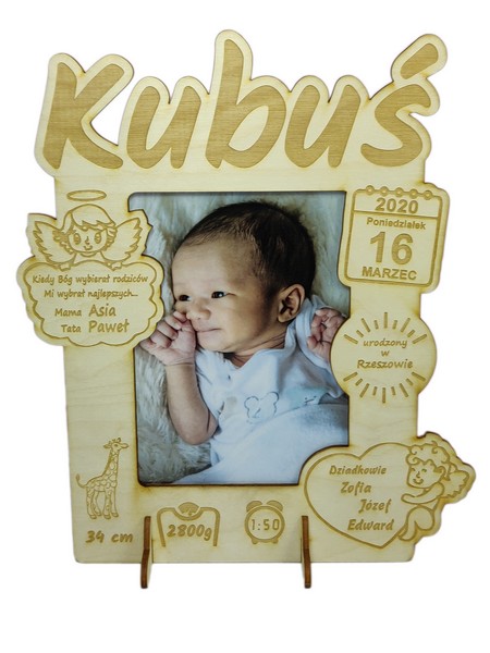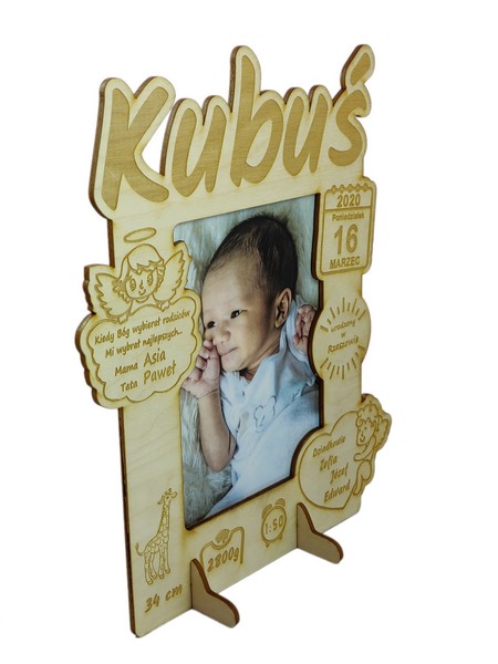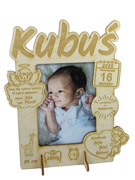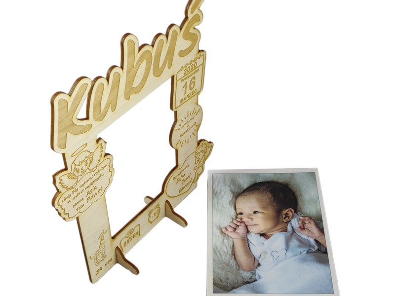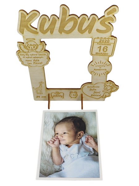 W środku ramki umieszczone jest wydrukowane i zalaminowane zdjęcie nowonarodzonego dziecka.