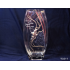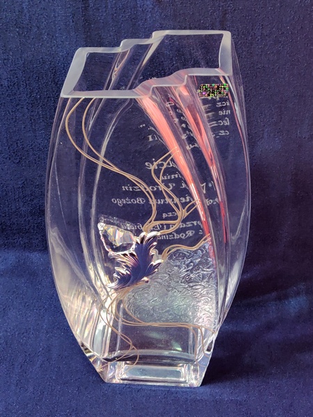 Wazon ozdobiony jest umieszczonym centralnie efektownym kryształkiem, połączonym z srebrnymi elementami oraz przezroczystym motywem roślinnym, który wygląda jak zatopiony i malowany na szkle.