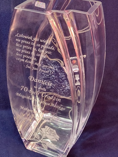 Na wazonie wykonany jest grawer ozdobników i dedykacji dla urodzinowego jubilata.