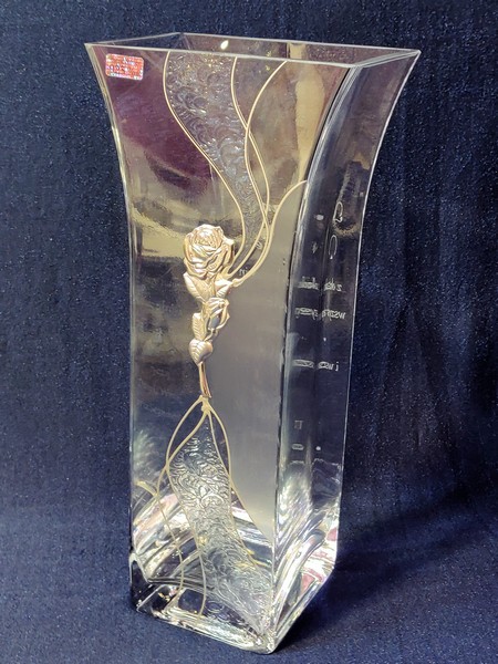 Wazon ma kształt prostego wydłużonego lejka. Wazon ozdobiony jest umieszczonym centralnie pięknym posrebrzanym kwiatem róży.