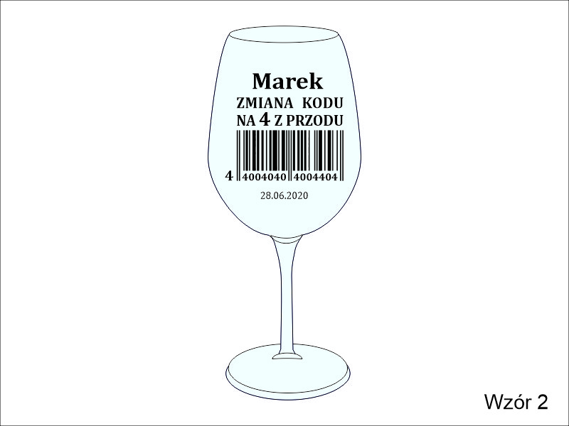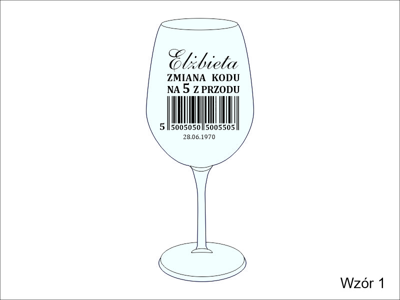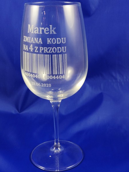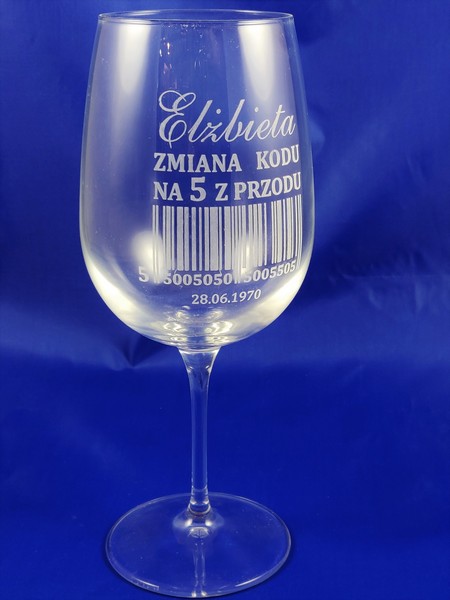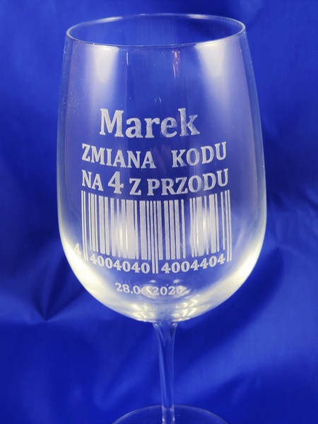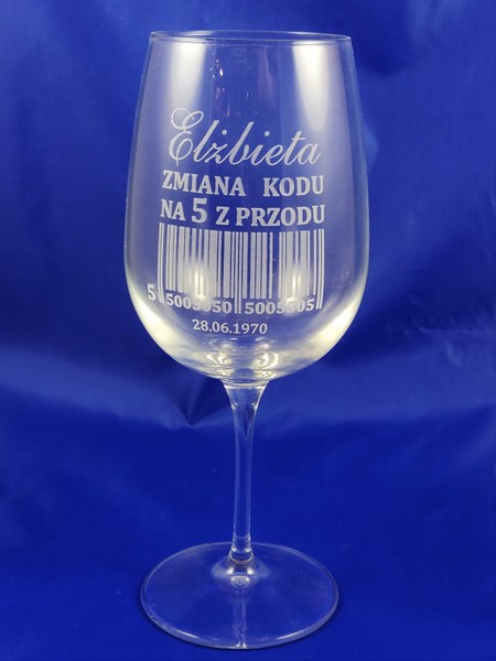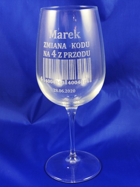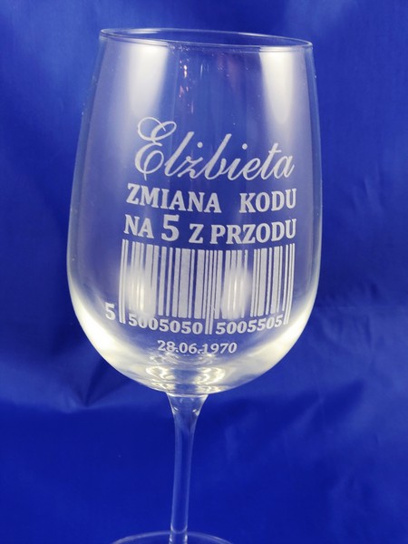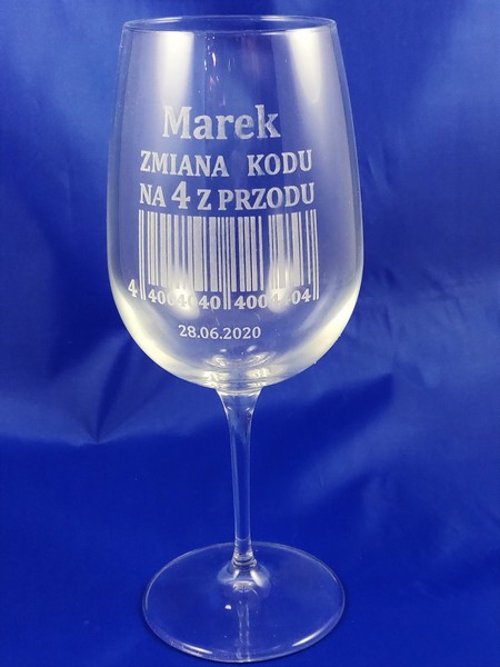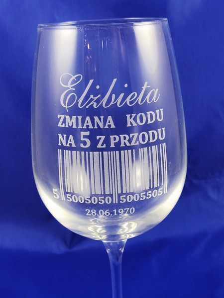Na kieliszku wykonany jest grawer żartobliwej dedykacji "Zmiana kodu na ... z przodu" oraz grafiki przedstawiającej kod kreskowy w nawiązaniu do wieku jubilata.