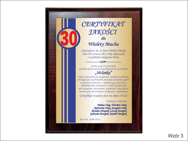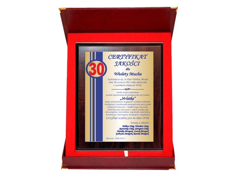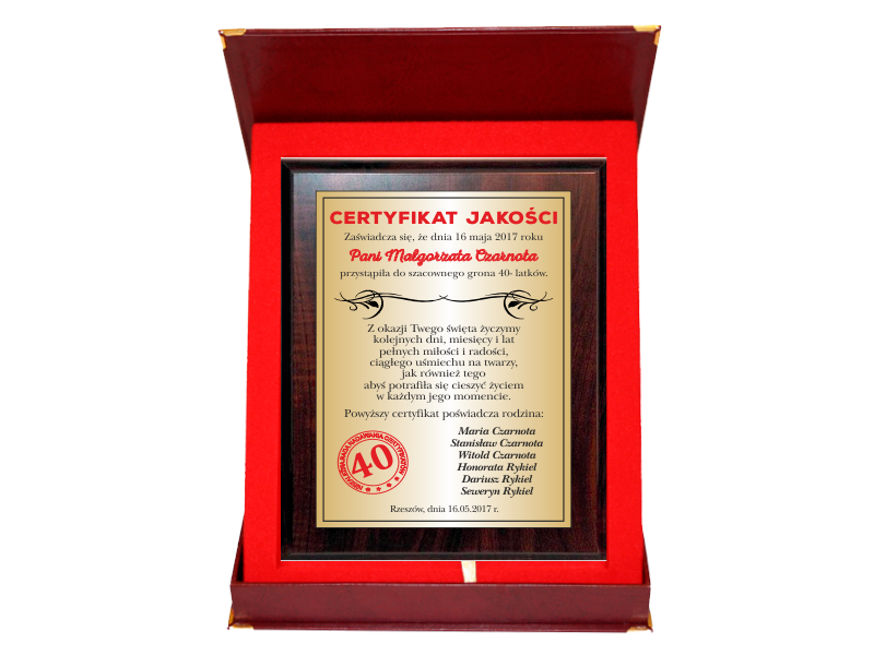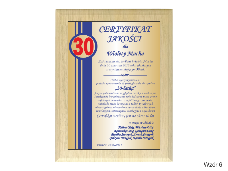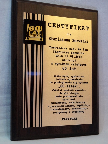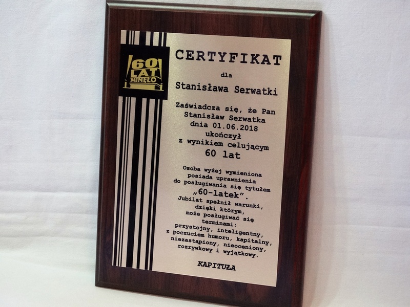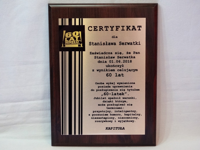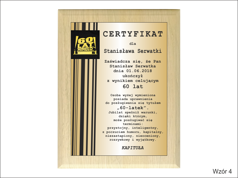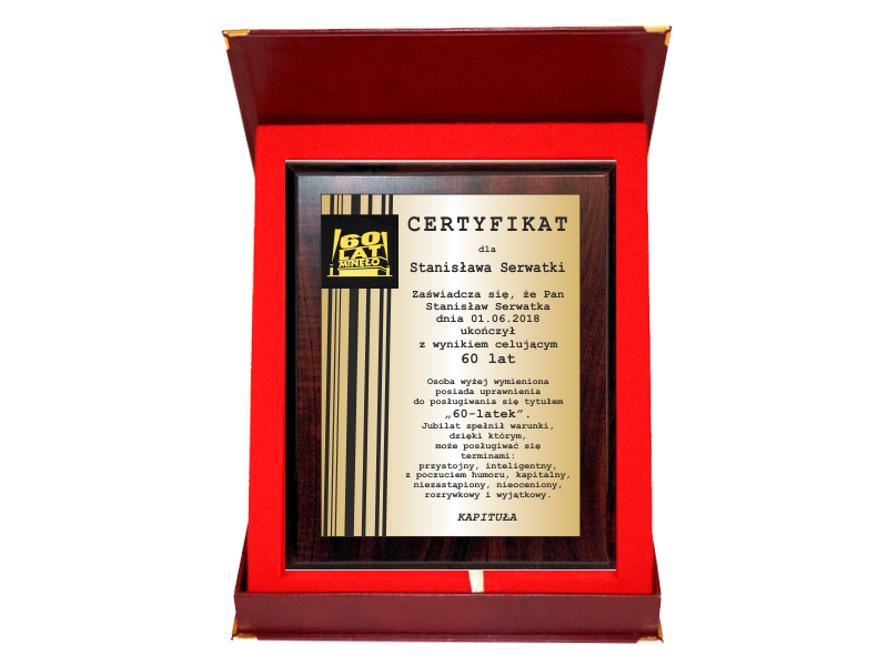 Okolicznościowy Certyfikat z okazji Urodzin w postaci dyplomu drewnianego na standardowym podkładzie.