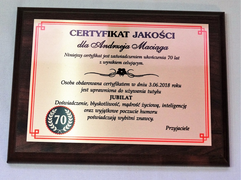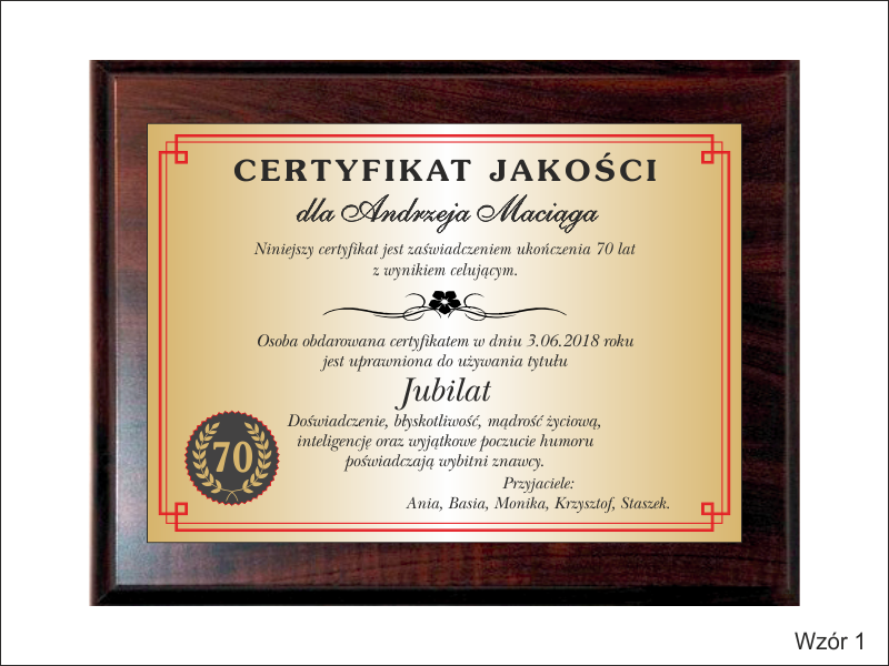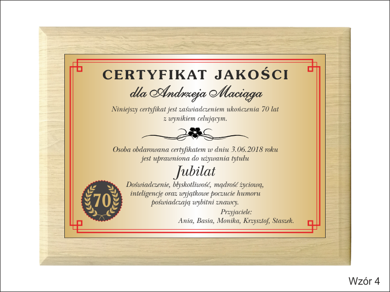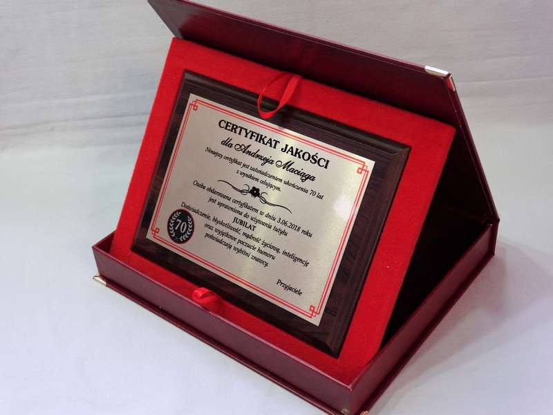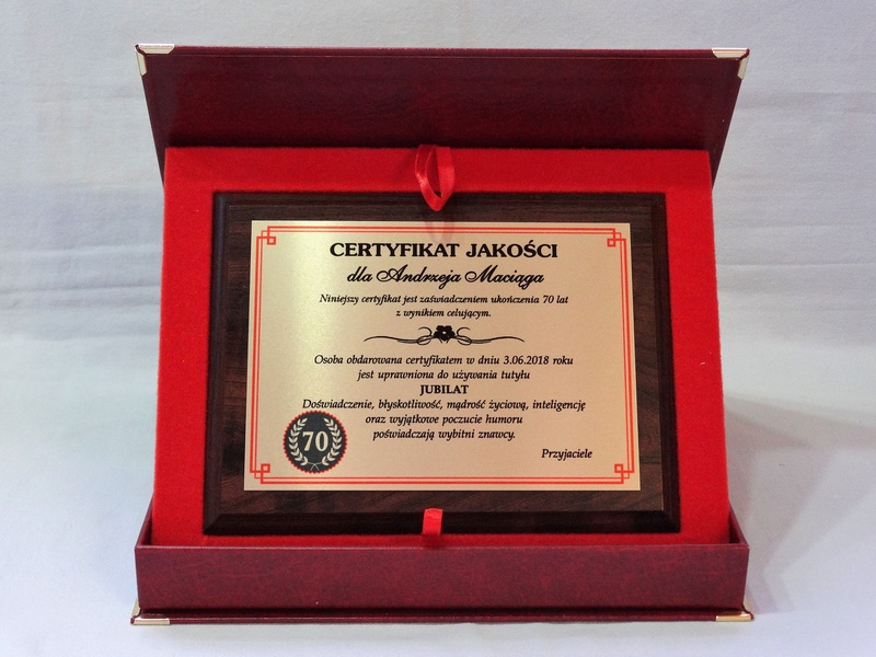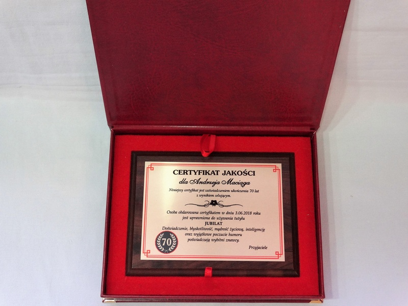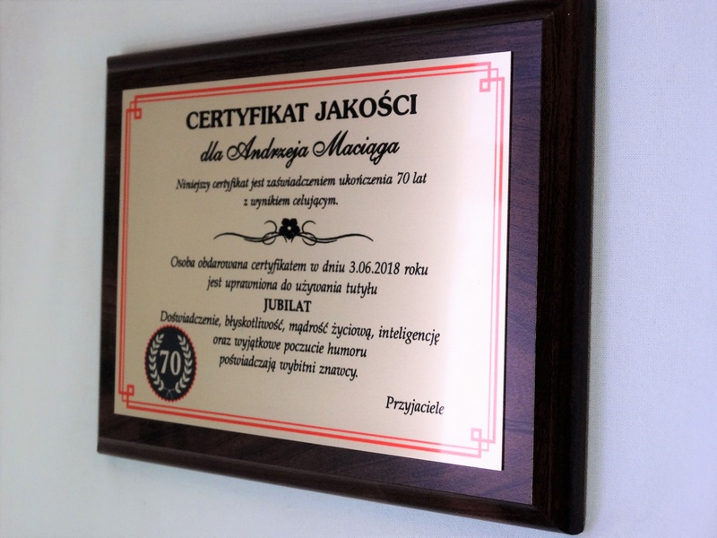 Okolicznościowy Certyfikat z okazji jubileuszu urodzin w postaci dyplomu drewnianego na standardowym podkładzie.