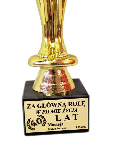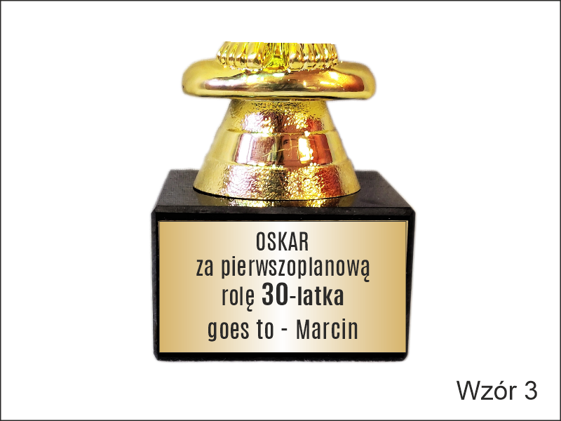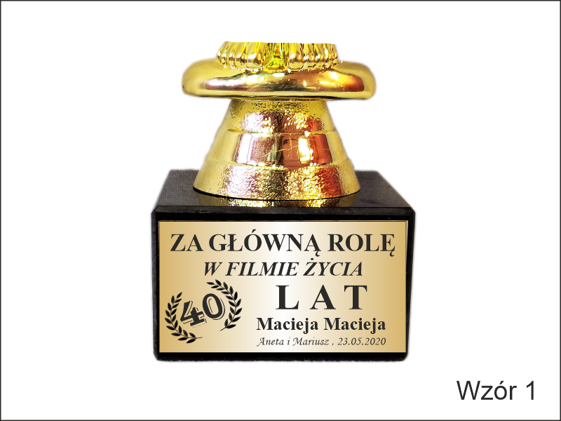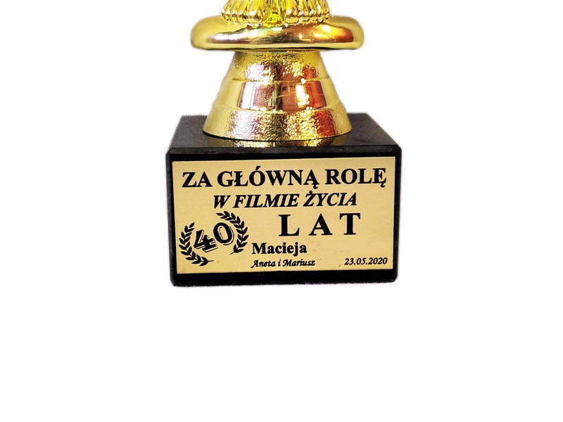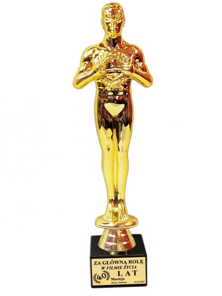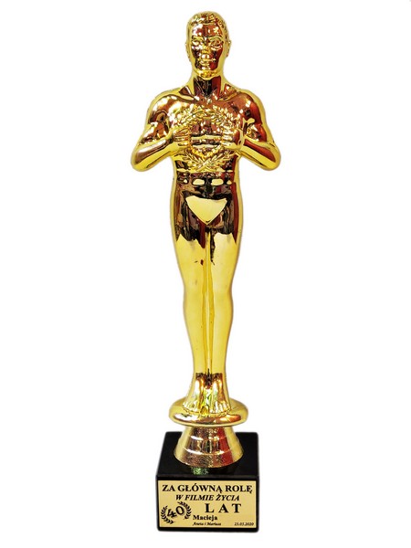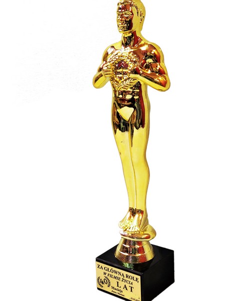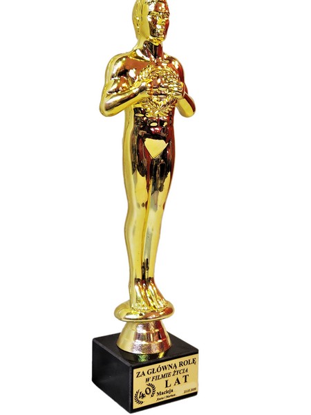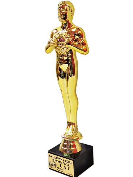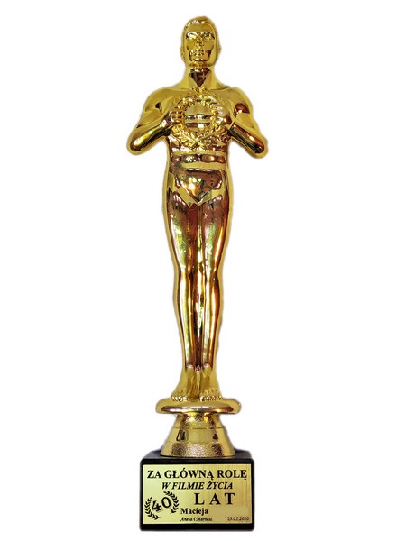 Pamiątkowy upominek urodzinowy w formie statuetki Oskara na postumencie z grawerem dedykacji.
