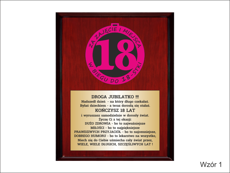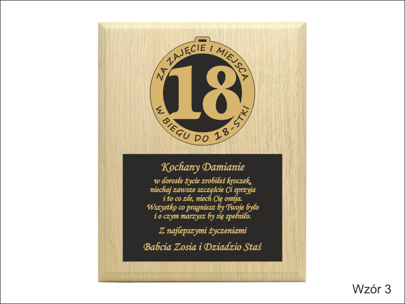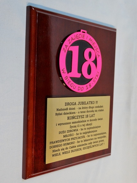Pamiątkowy złożony dyplom okolicznościowy z okazji 18-stych Urodzin na standardowym drewnianym lakierowanym podkładzie, składający się: