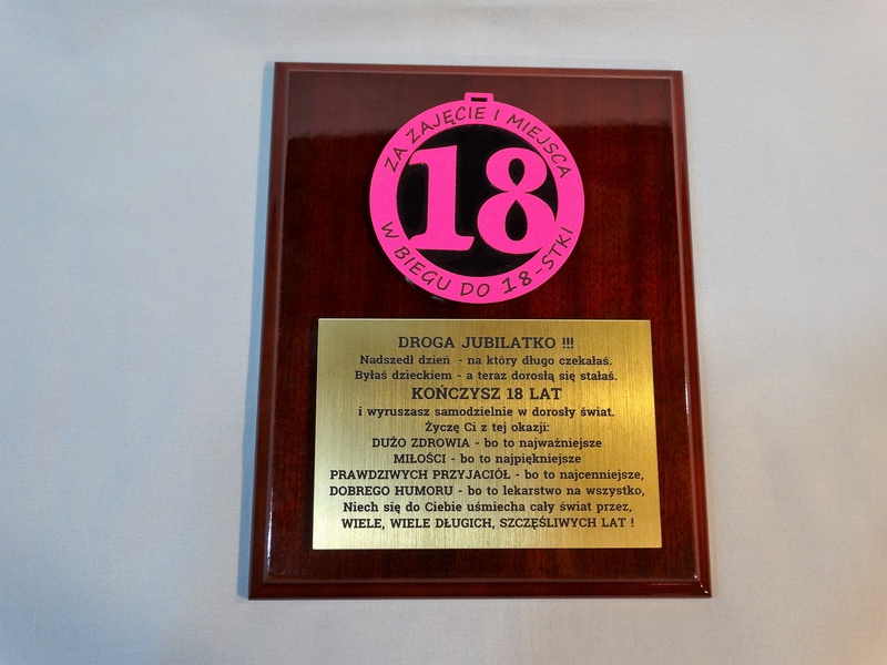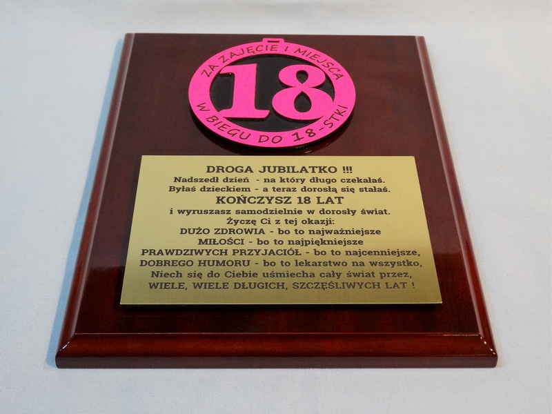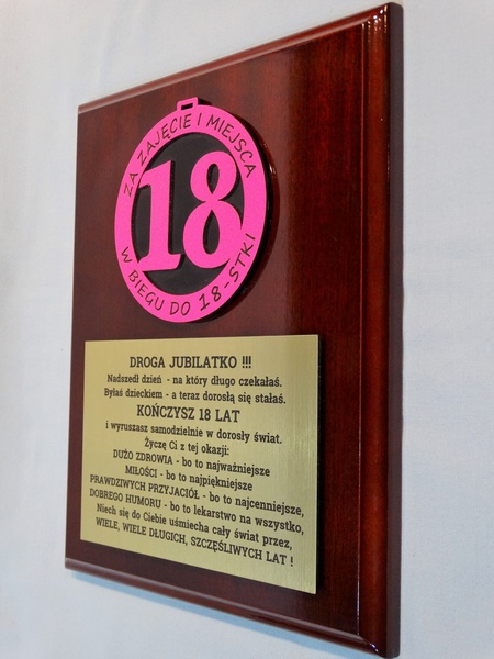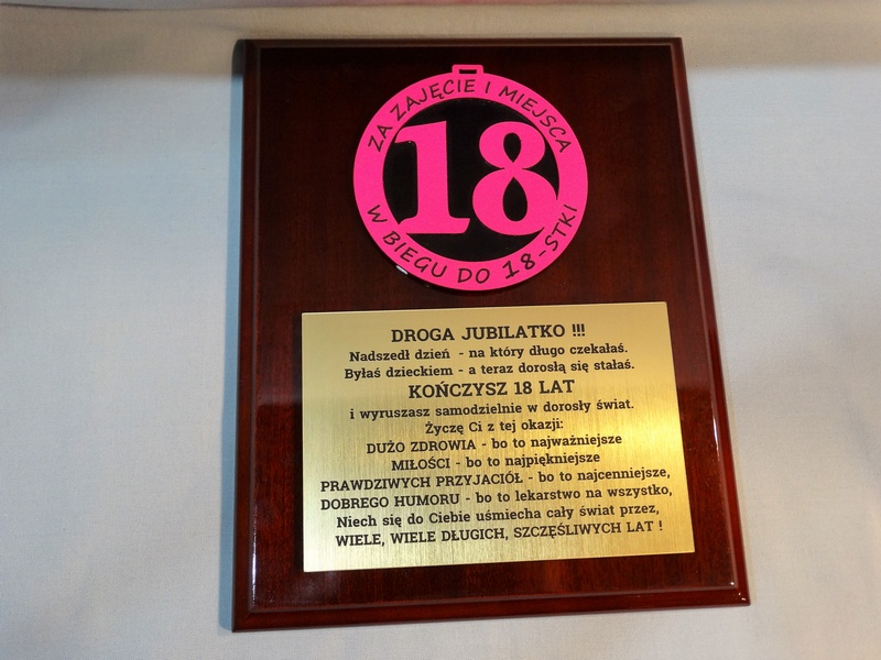 - z medalu wyciętego i wygrawerowanego z różowego laminatu.