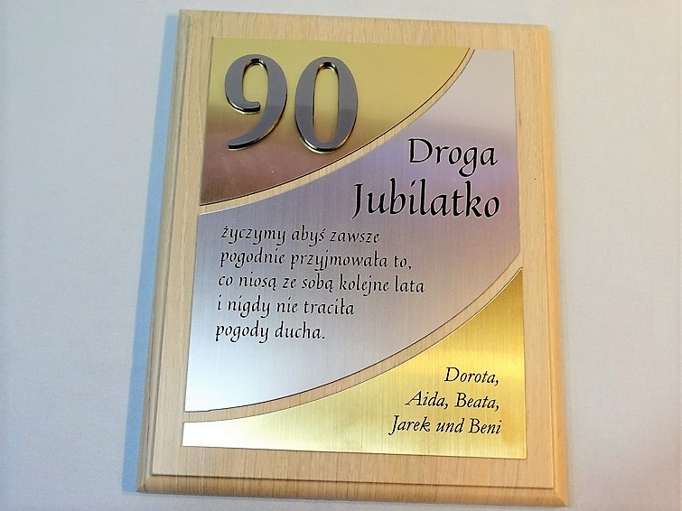 Upominek na jubileusz urodzin w postaci drewnianego dyplomu okolicznościowego lakierowanym podkładzie.