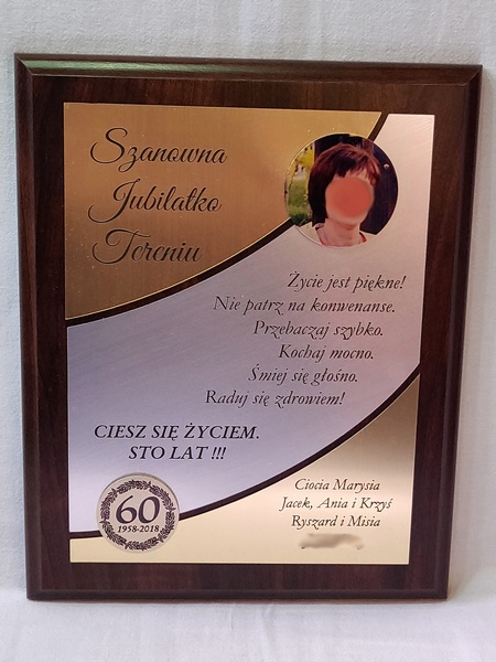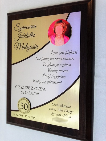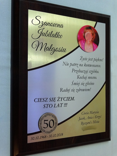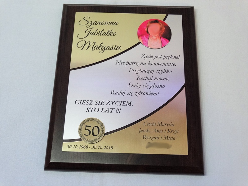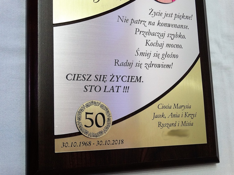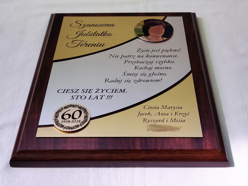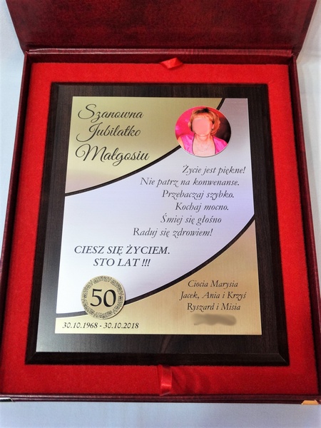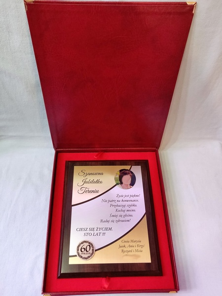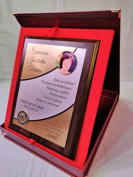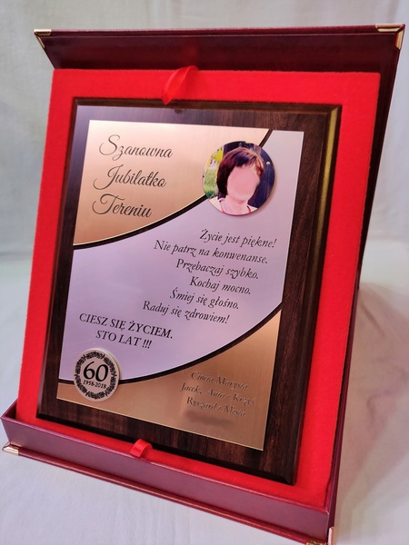 - z dopasowanych do siebie złotego i srebrnego laminatów z grawerowaną dedykacją oraz