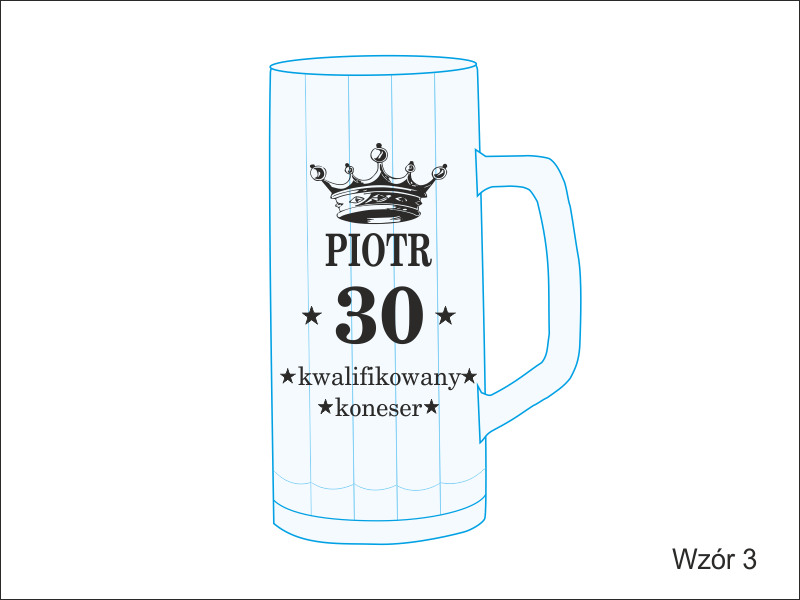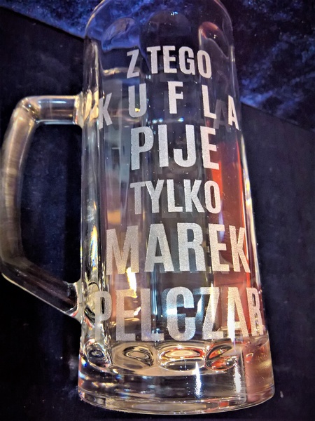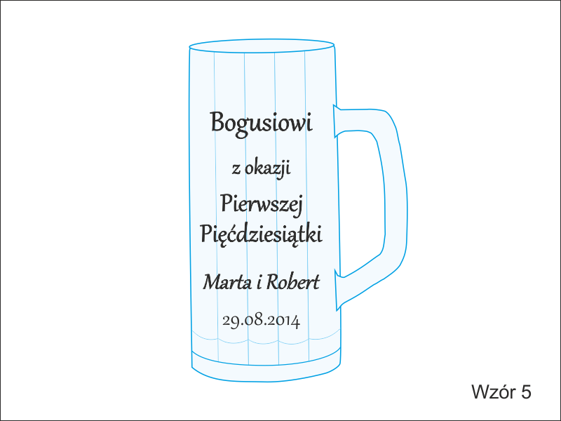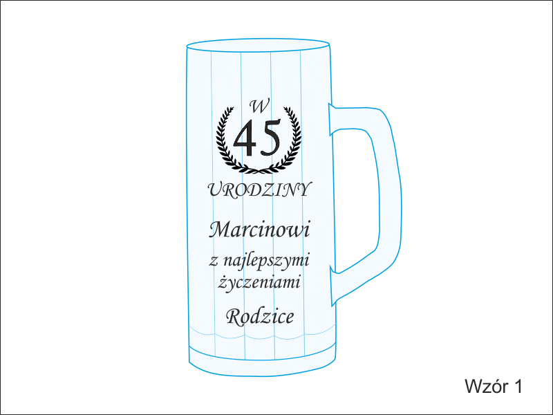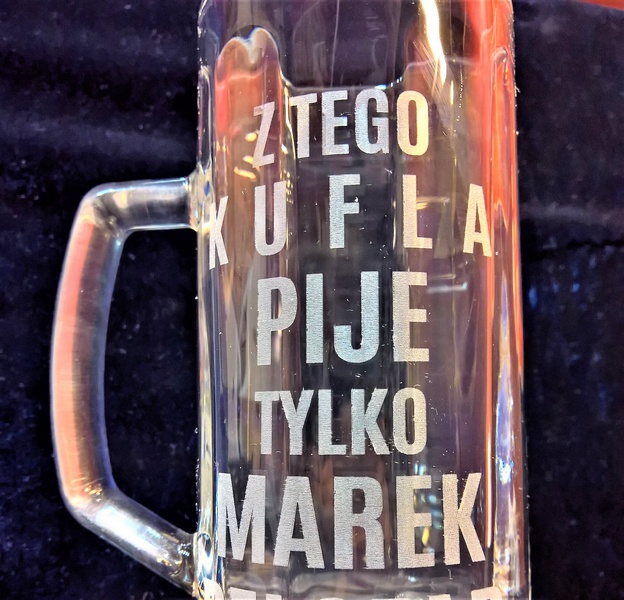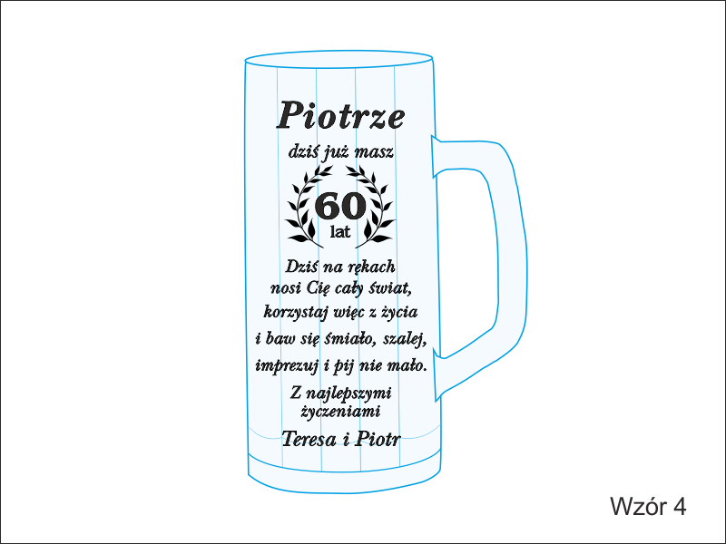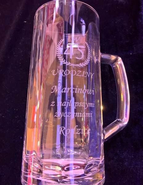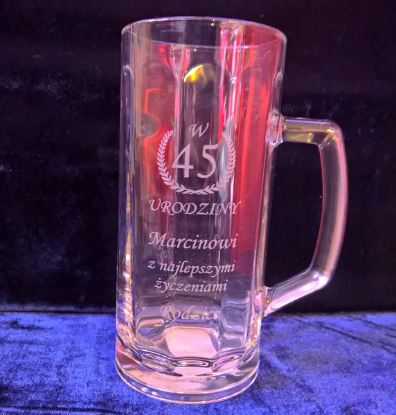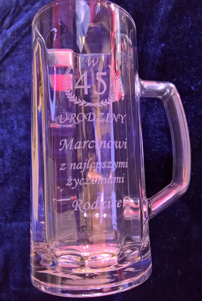 Na kuflu wykonany jest grawer ozdobnych grafik i dedykacji dla Jubilata.