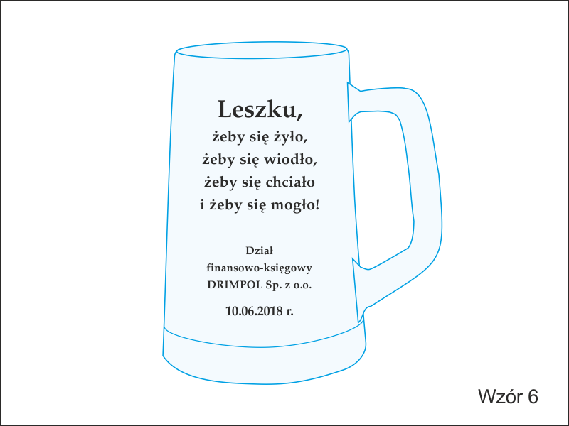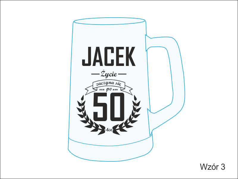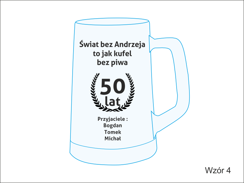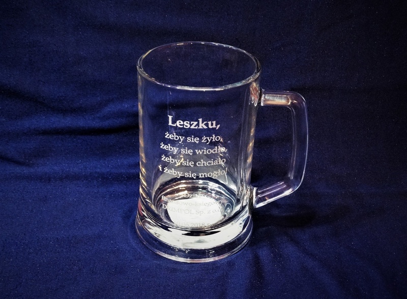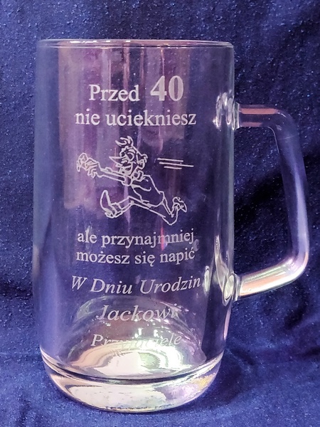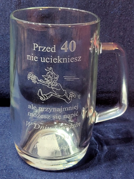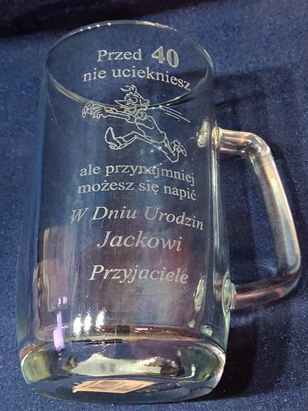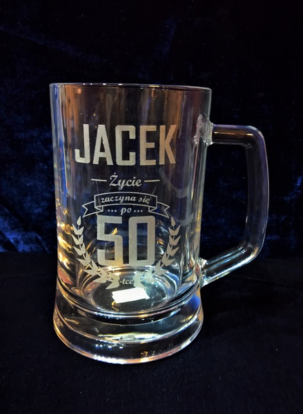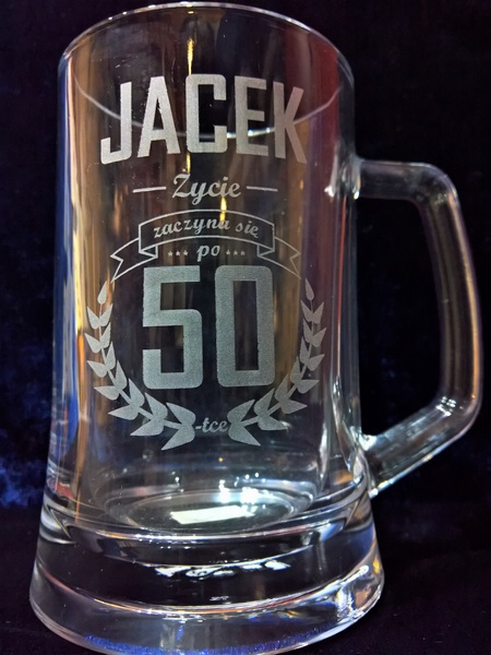Na kuflu wykonany jest grawer ozdobnych grafik i dedykacji dla Jubilata.