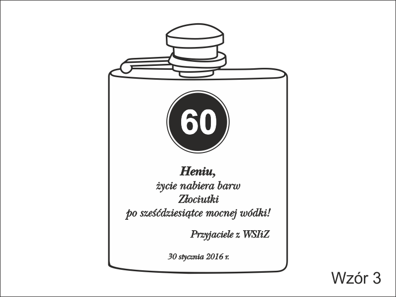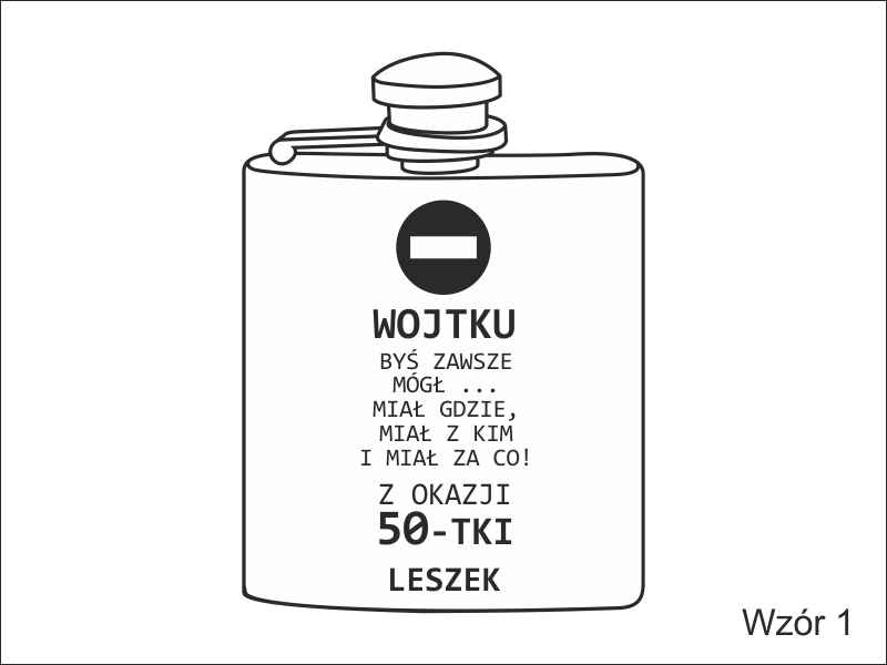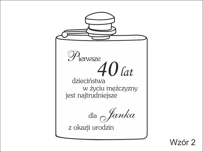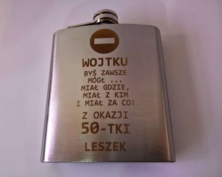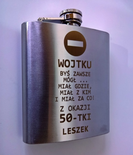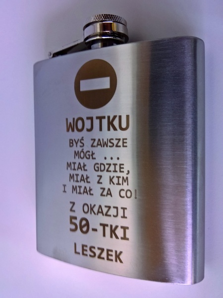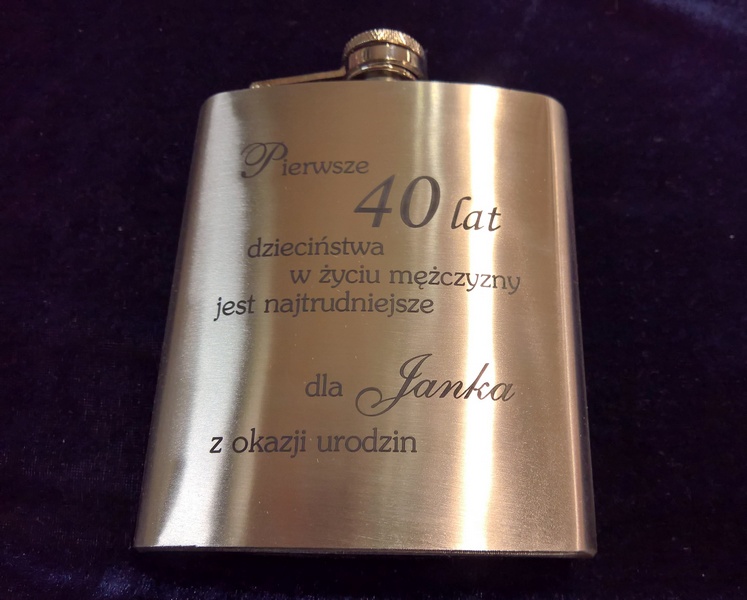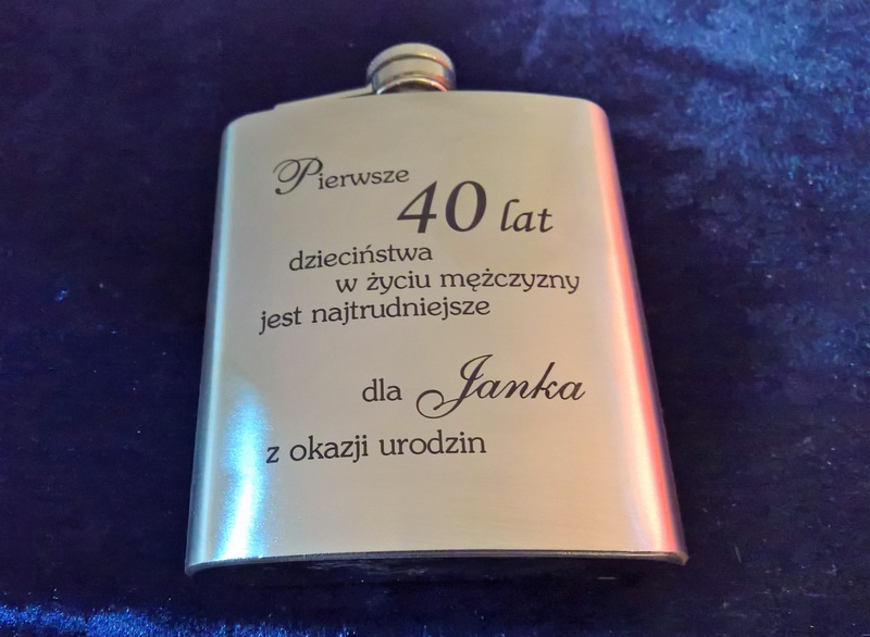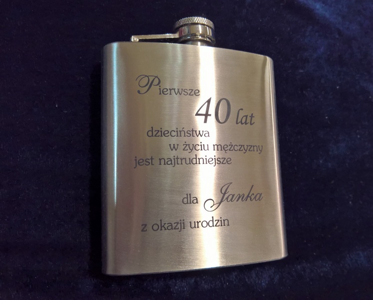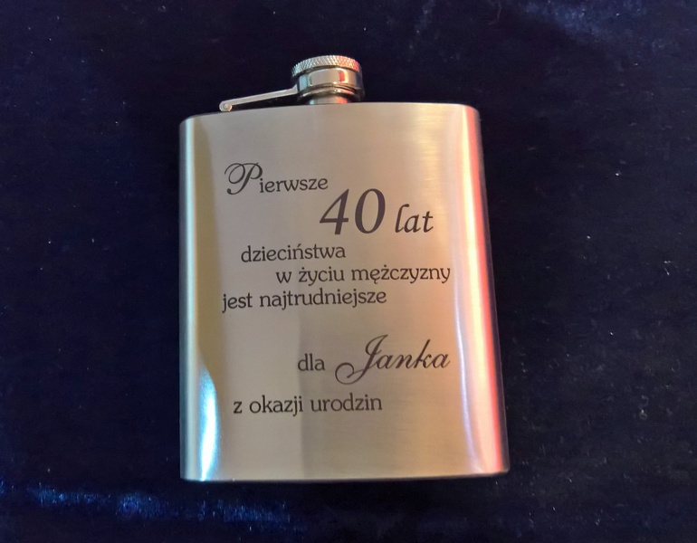 Urodzinowy prezent w postaci standardowej metalowej piersiówki z grawerem dedykacji.