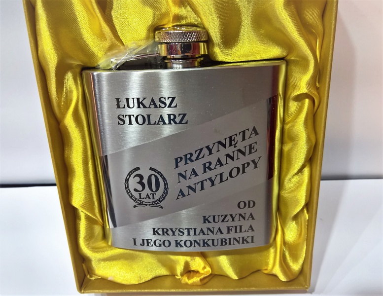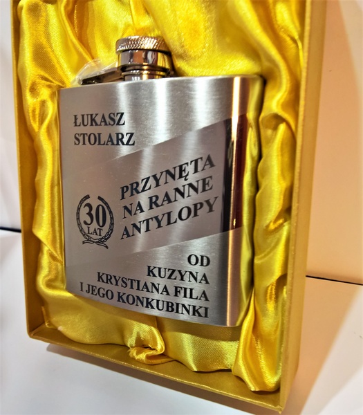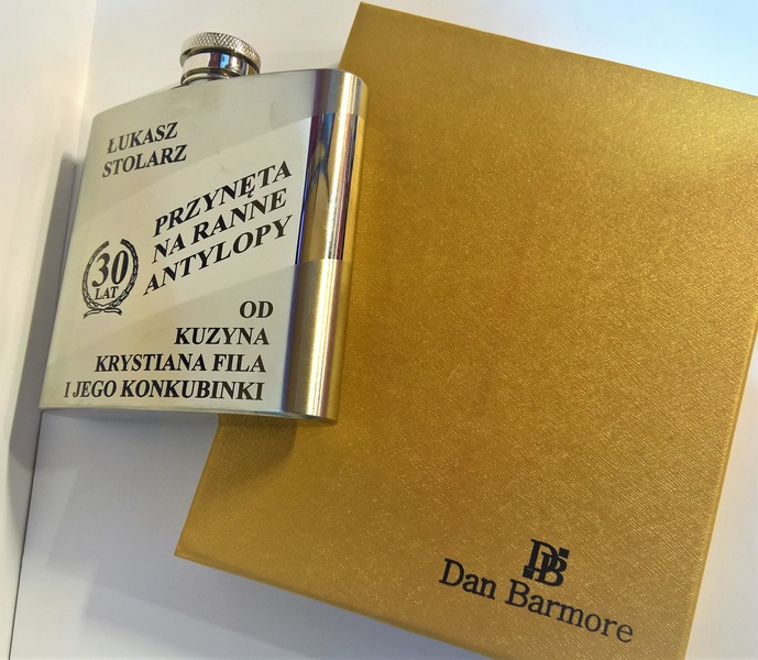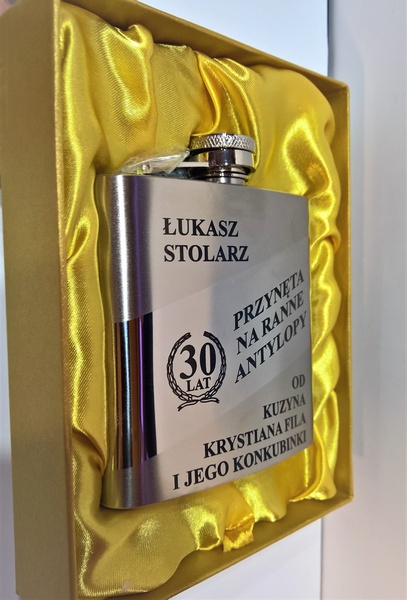 Na piersiówce wykonany jest grawer indywidualnej urodzinowej dedykacji przez co powstaje niepowtarzalny prezent urodzinowy.
