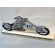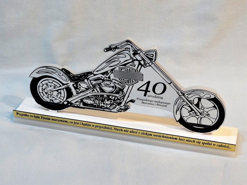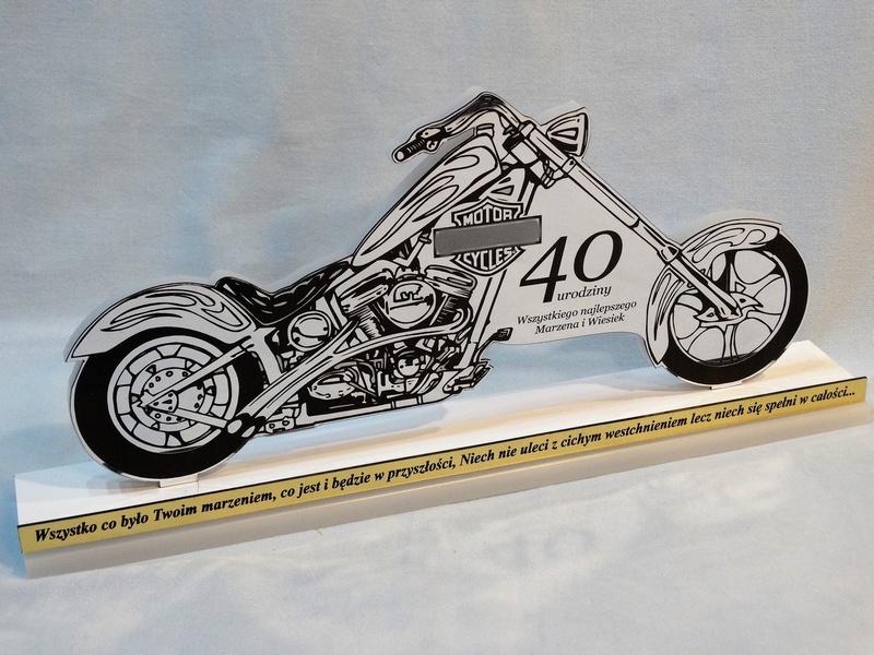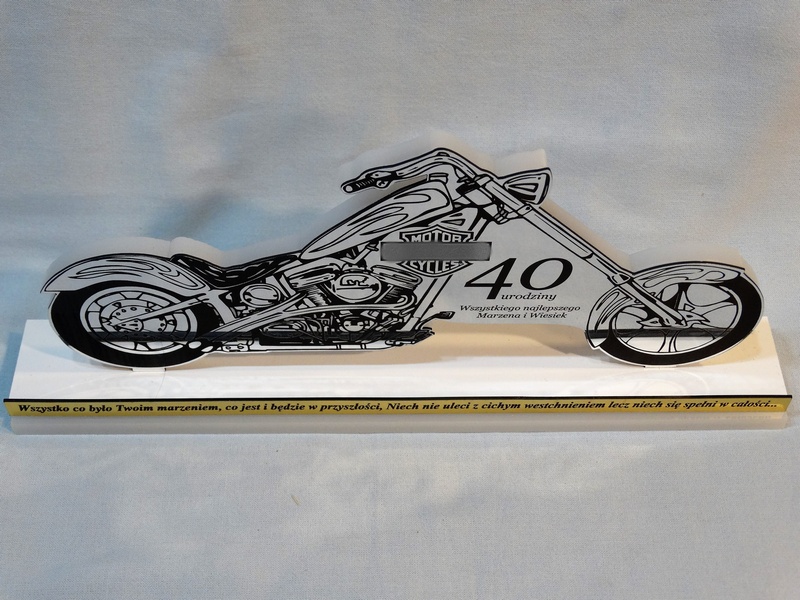 Upominek z okazji urodzin w postaci pamiątkowej statuetki w kształcie motocykla wykonanej z białej pleksi i srebrnego laminatu, z grawerem dedykacji i ozdobnych grafik.
