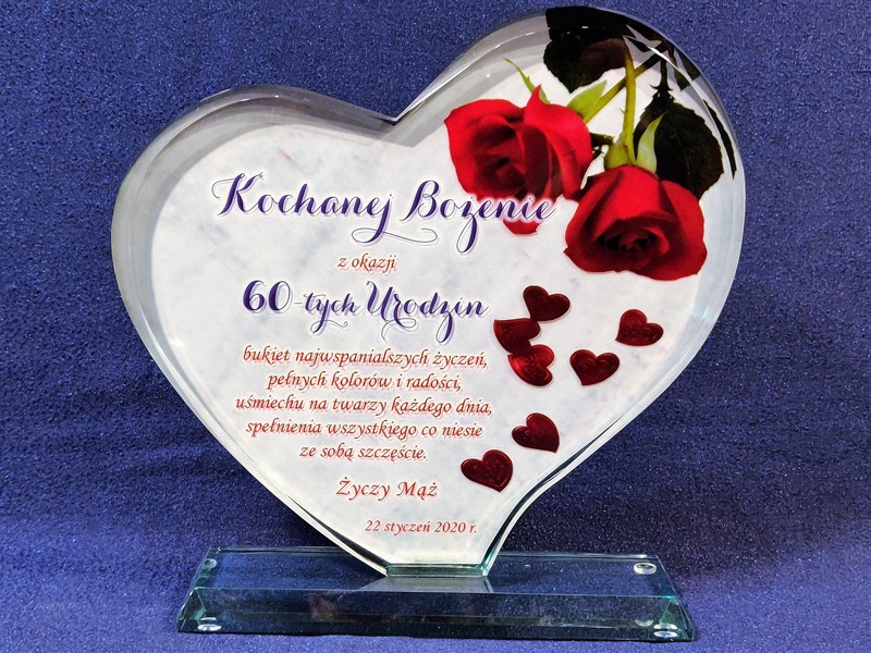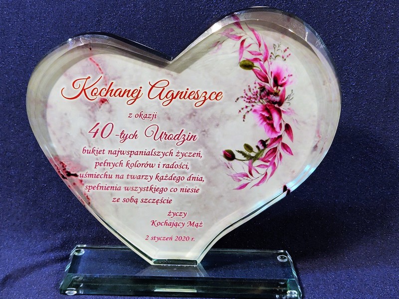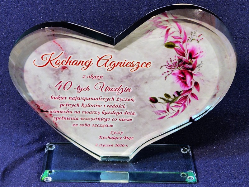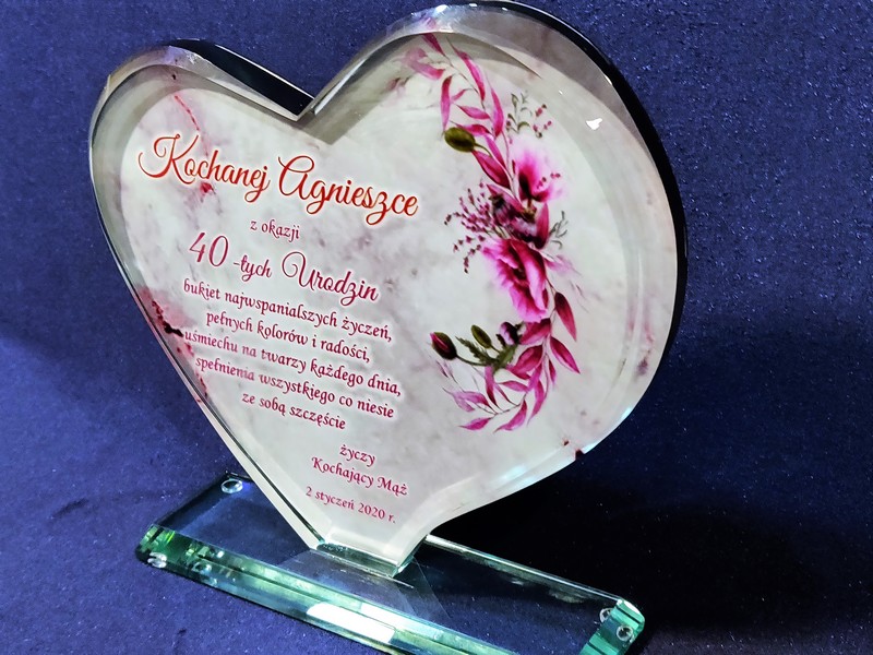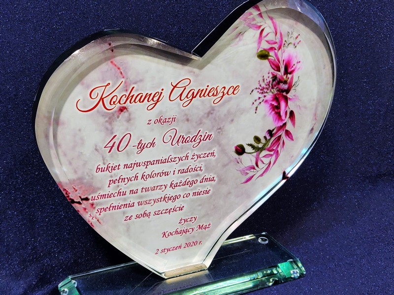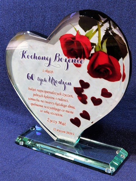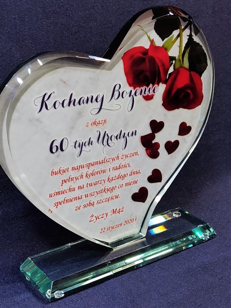 Upominek urodzinowy w postaci statuetki szklanej G041 w kształcie serca z nadrukiem dedykacji.
