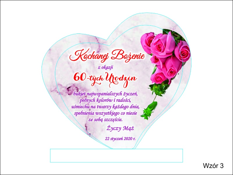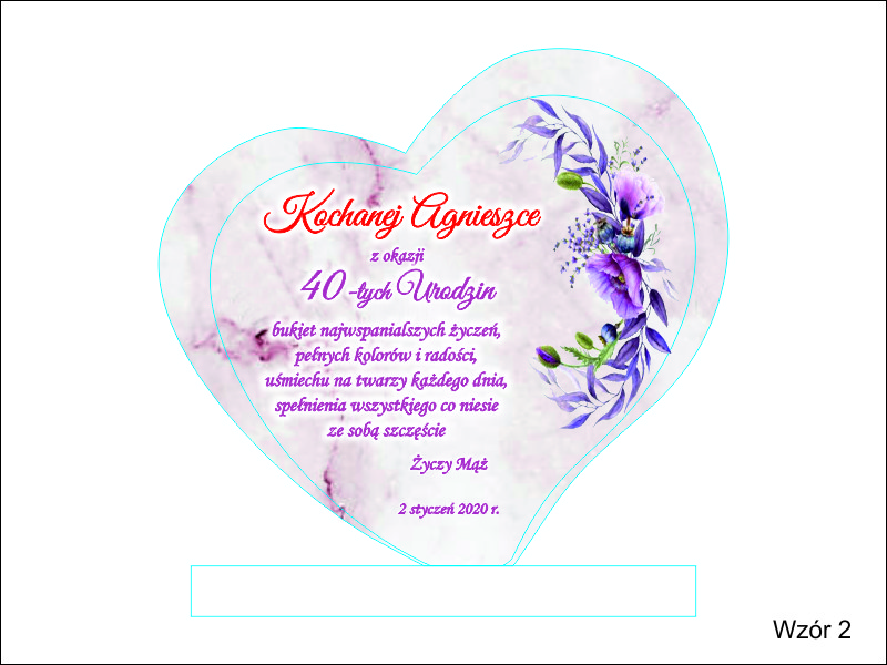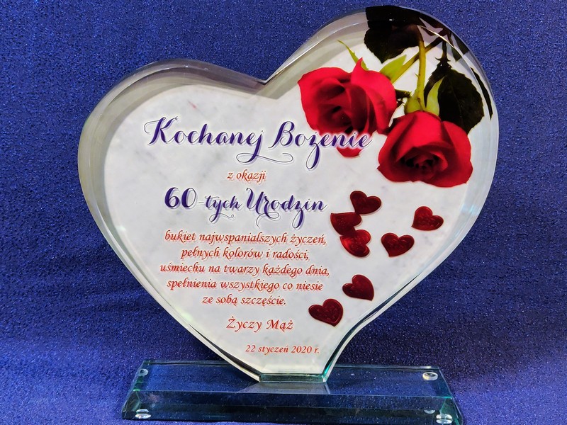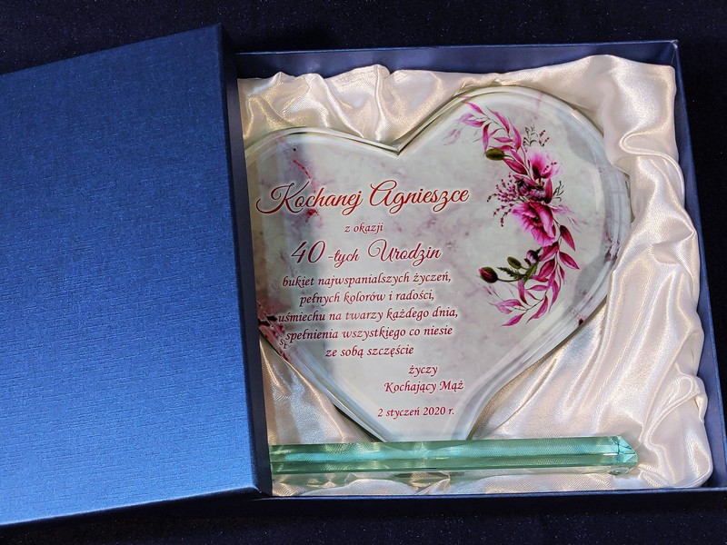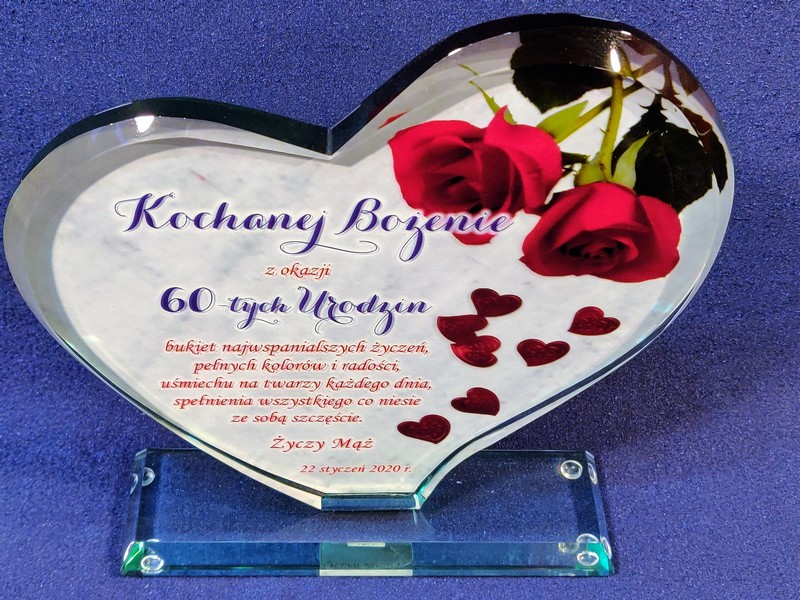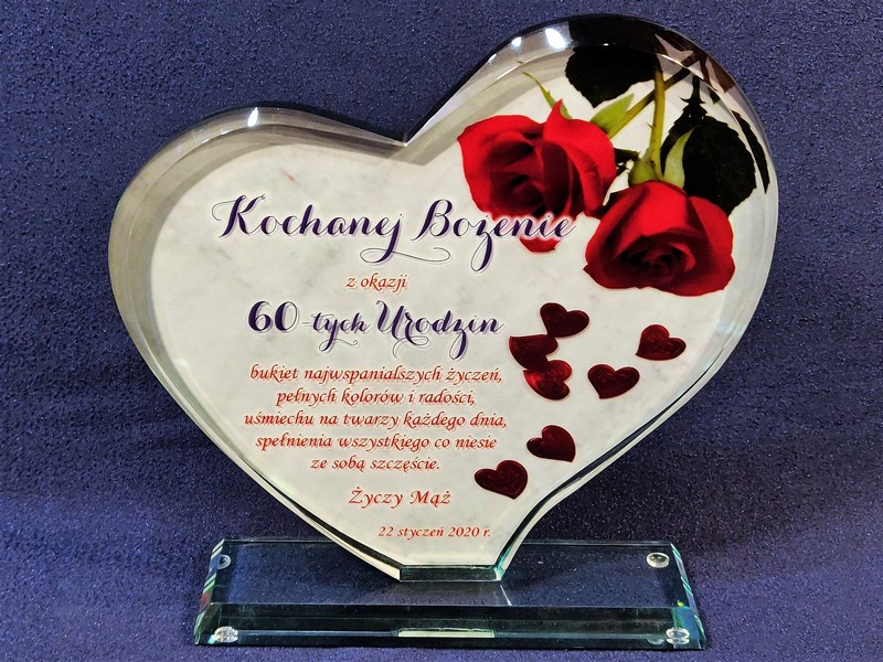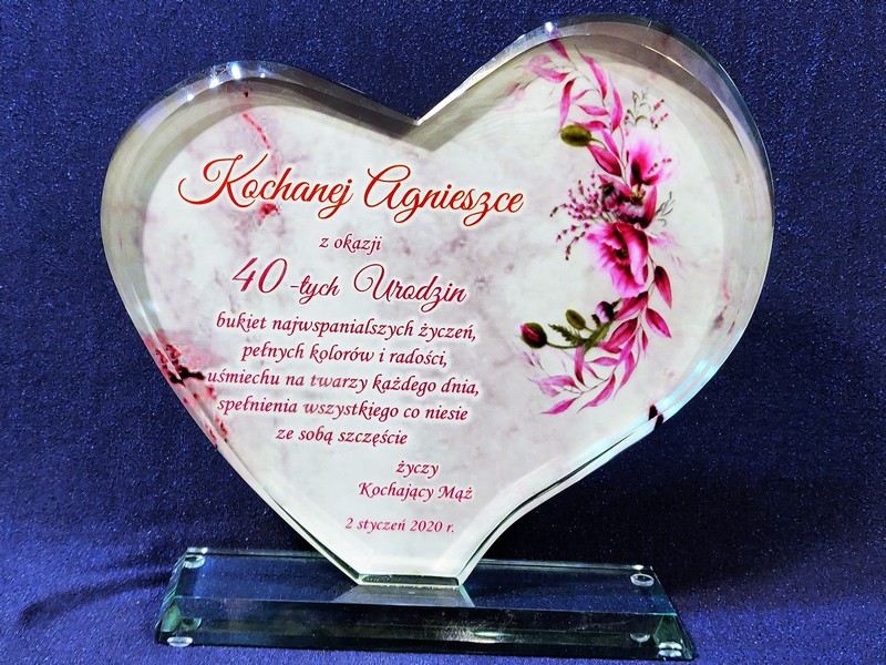 Upominek urodzinowy w postaci statuetki szklanej G041 w kształcie serca z nadrukiem dedykacji.