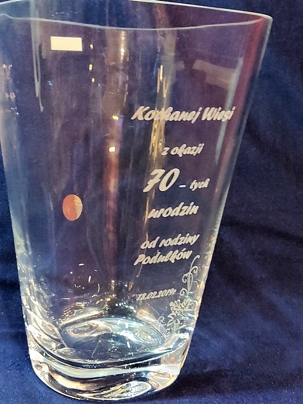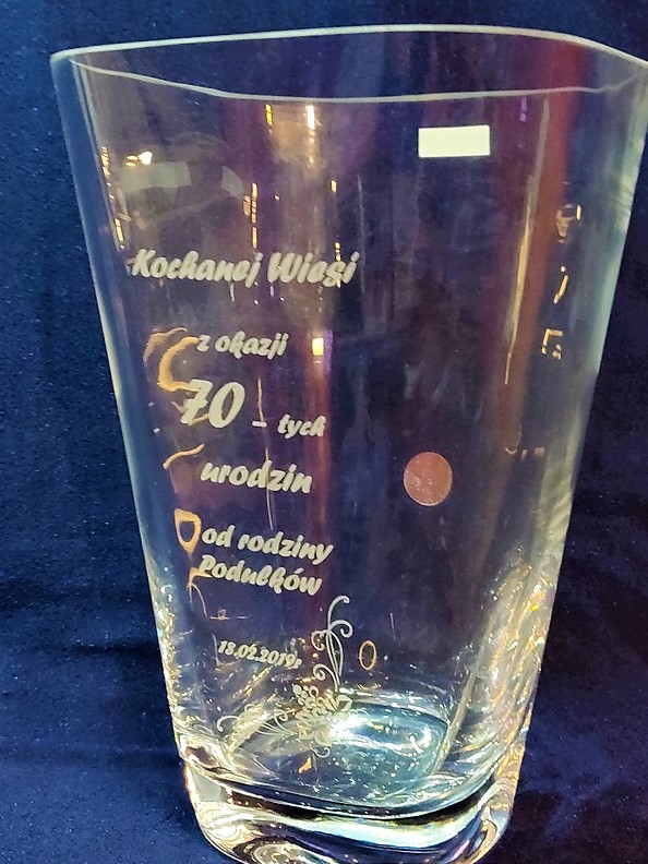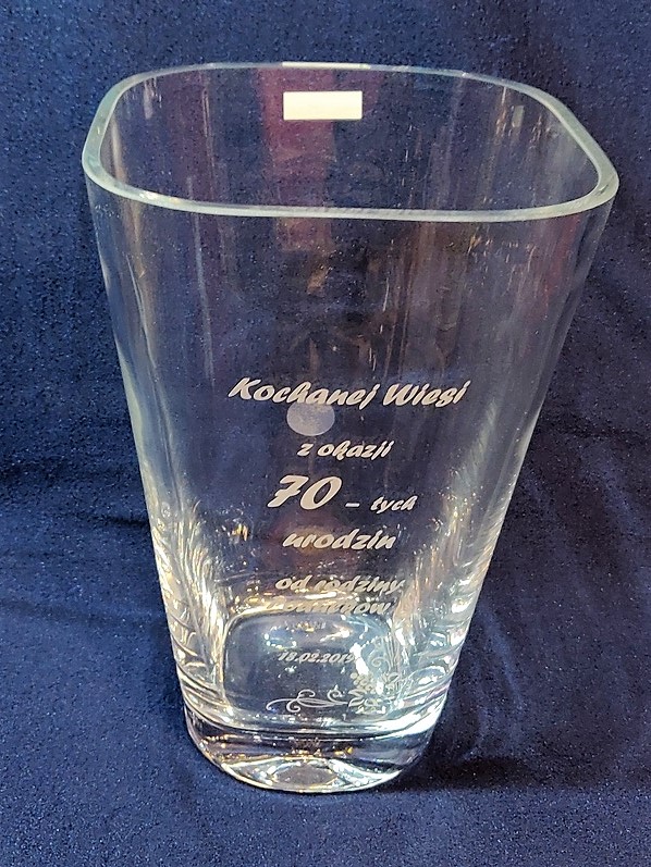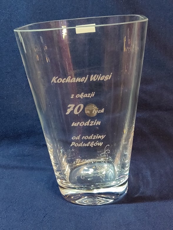 Na wazonie wykonany jest grawer ozdobnych grafik i dedykacji dla Jubilata.