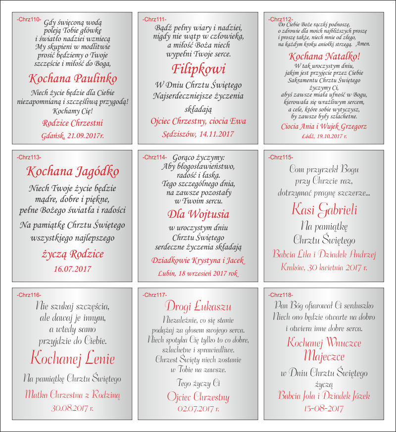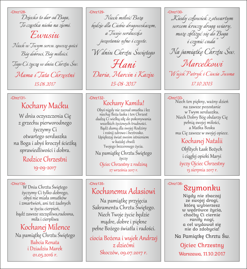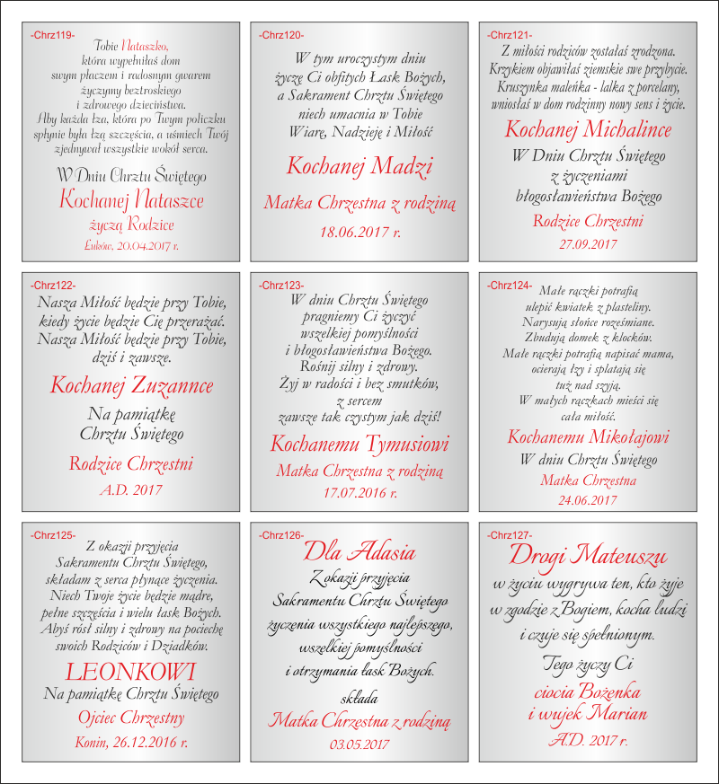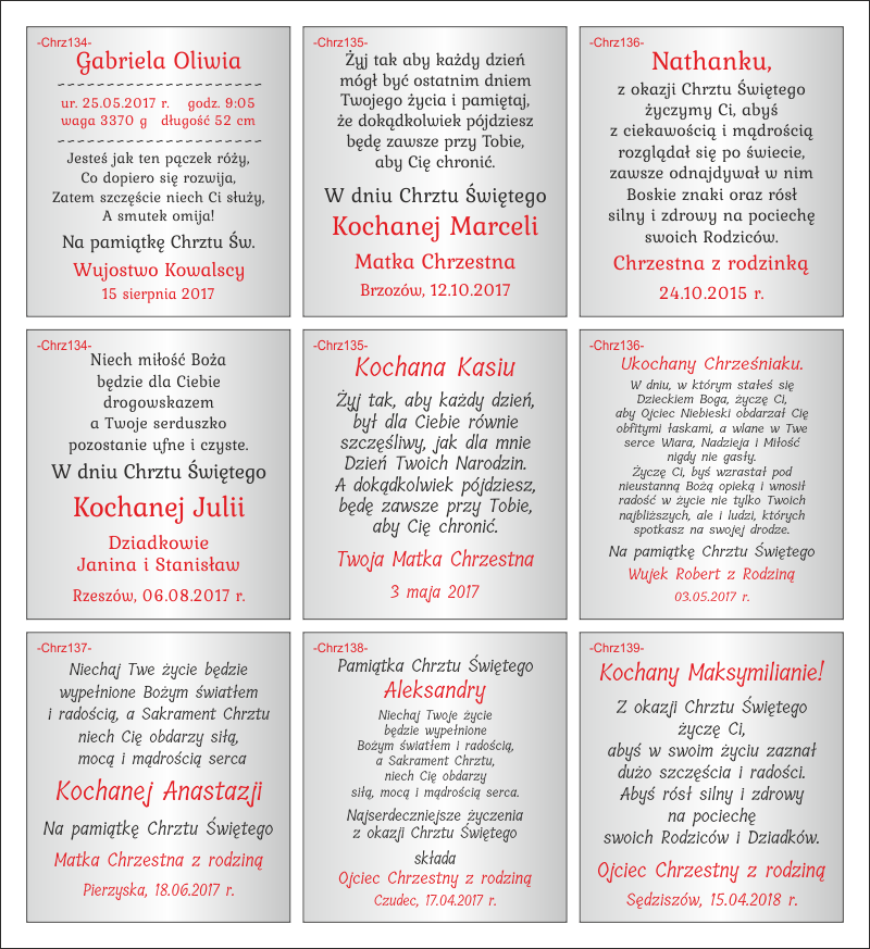 Zawierają przykładowe treści dedykacji do wykorzystania przy wykonywaniu tabliczek czy prezentów okolicznościowych.