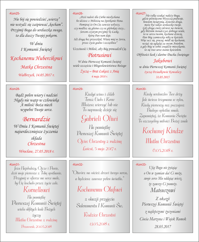 Zawierają przykładowe treści dedykacji do wykorzystania przy wykonywaniu tabliczek czy prezentów okolicznościowych.
