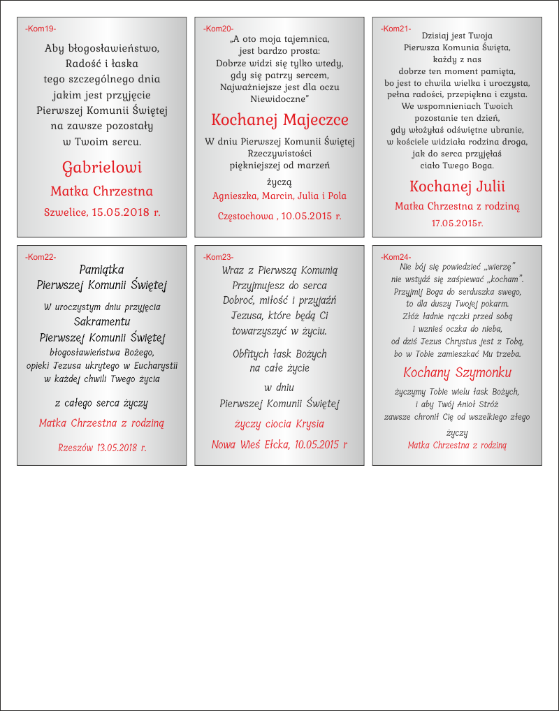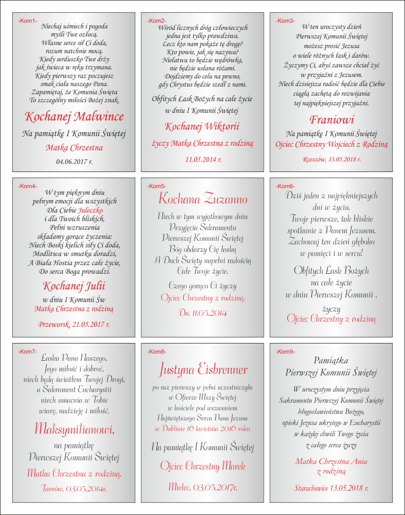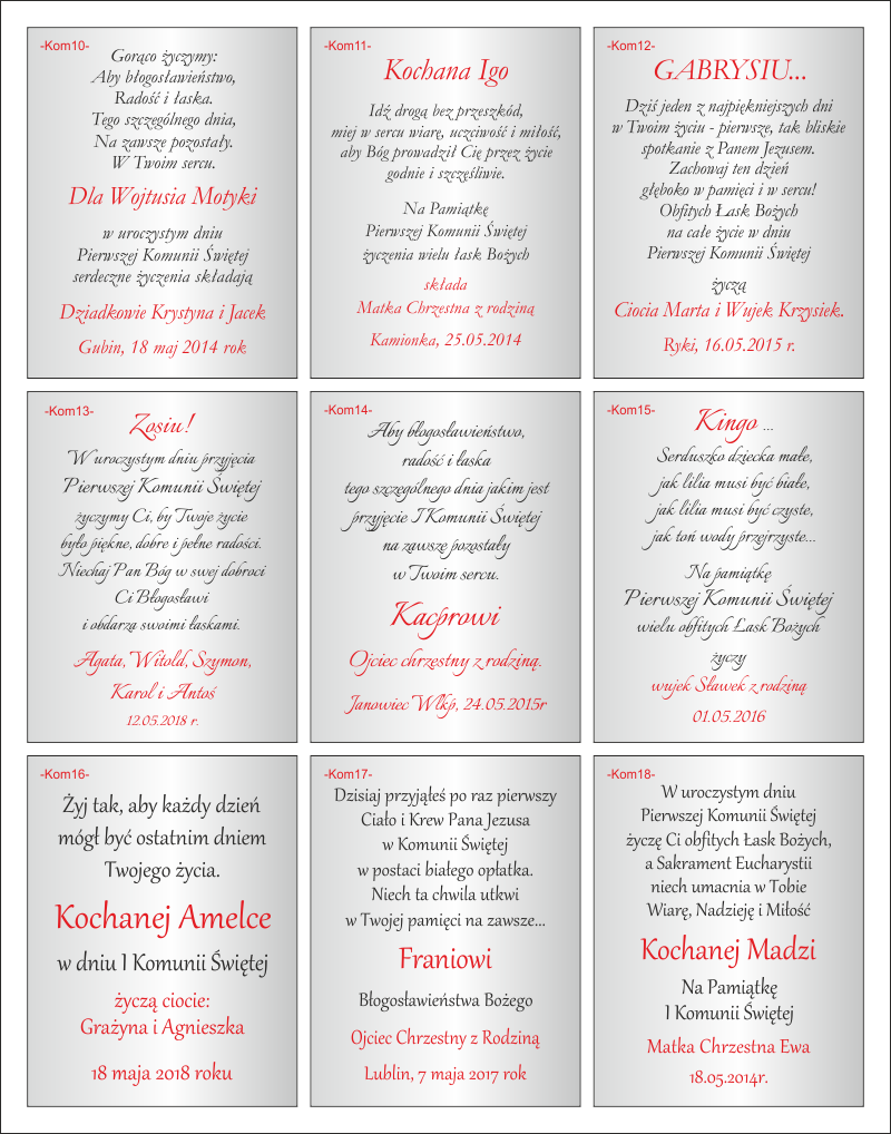 Wzory dedykacji z okazji Pierwszej Komunii Świętej zawierające w treści ogólne życzenia.