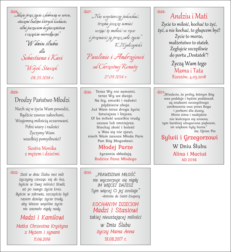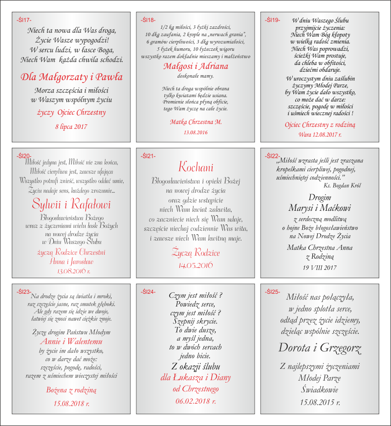 Zawierają przykładowe treści dedykacji do wykorzystania przy wykonywaniu tabliczek czy prezentów okolicznościowych.