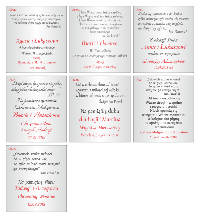 Zawierają przykładowe treści dedykacji do wykorzystania przy wykonywaniu tabliczek czy prezentów okolicznościowych.