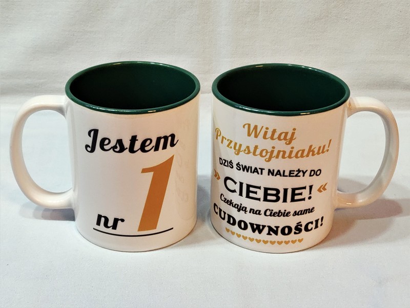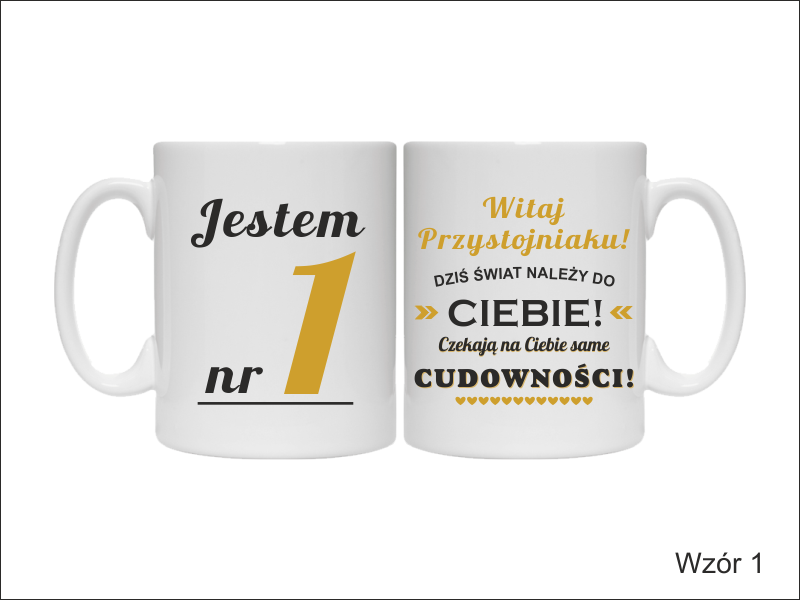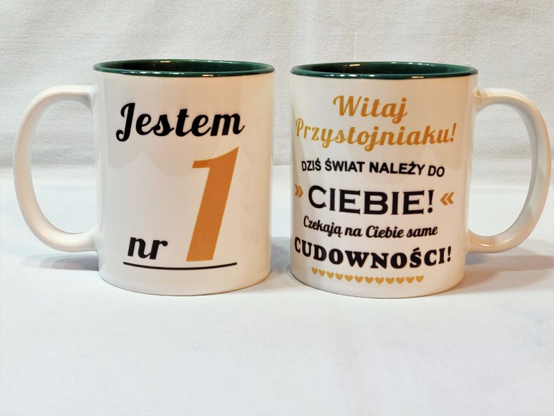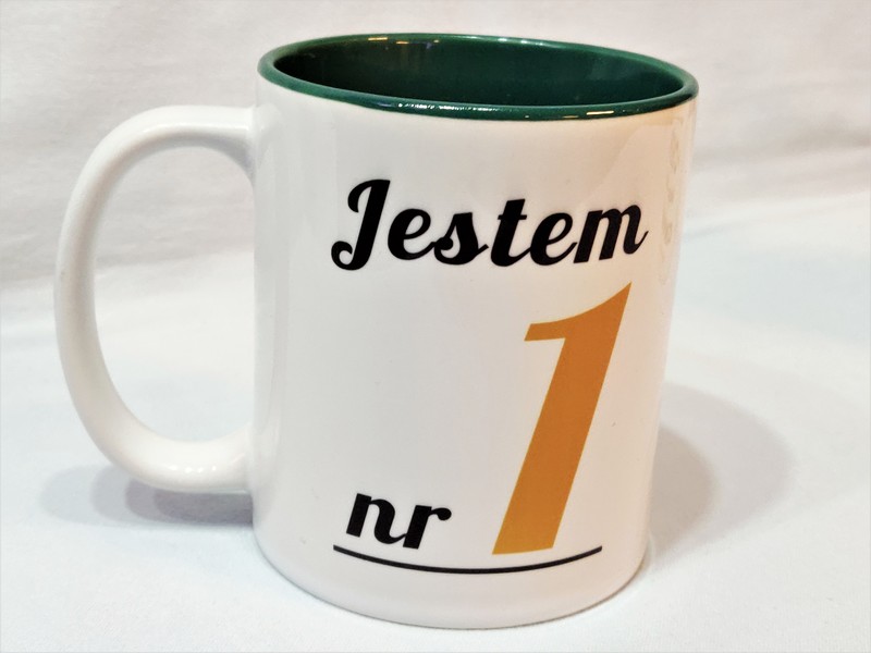 Na kubku wykonny jest pełnokolorowy nadruk pamiątkowej dedykacji "Jestem(ś) nr 1".