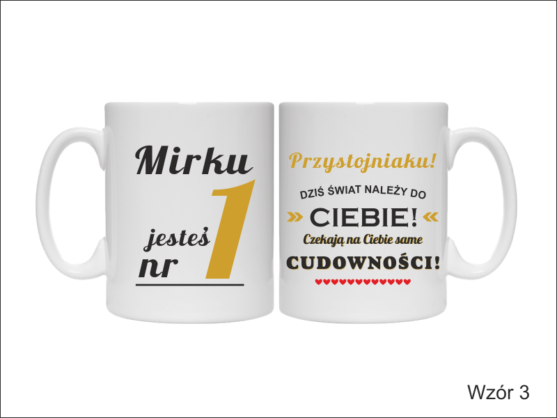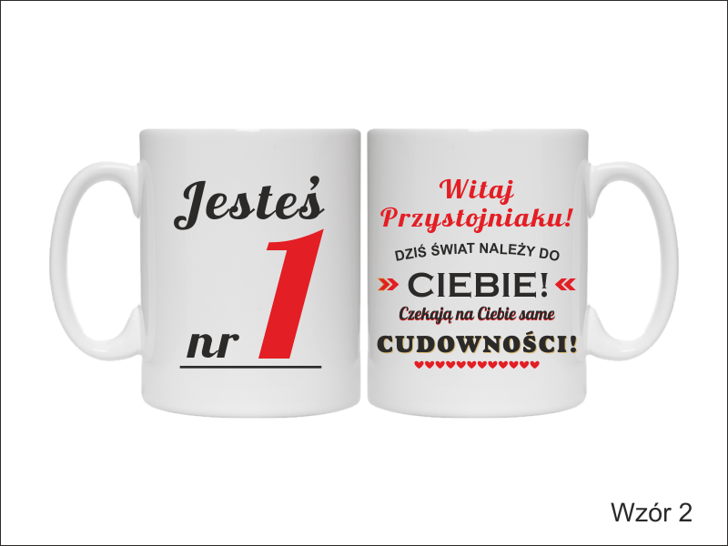 Nadruk dedykacji i grafik na kubku jest dowolny i można wykorzystać jeden z wzorów lub wykonać wg indywidualnych ustaleń.