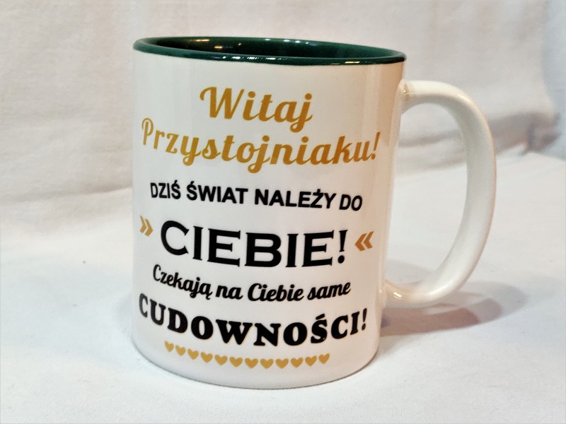Propozycja na upominek dla Niego w postaci białego kubka z kolorowym wnętrzem z nadrukiem.