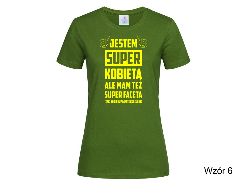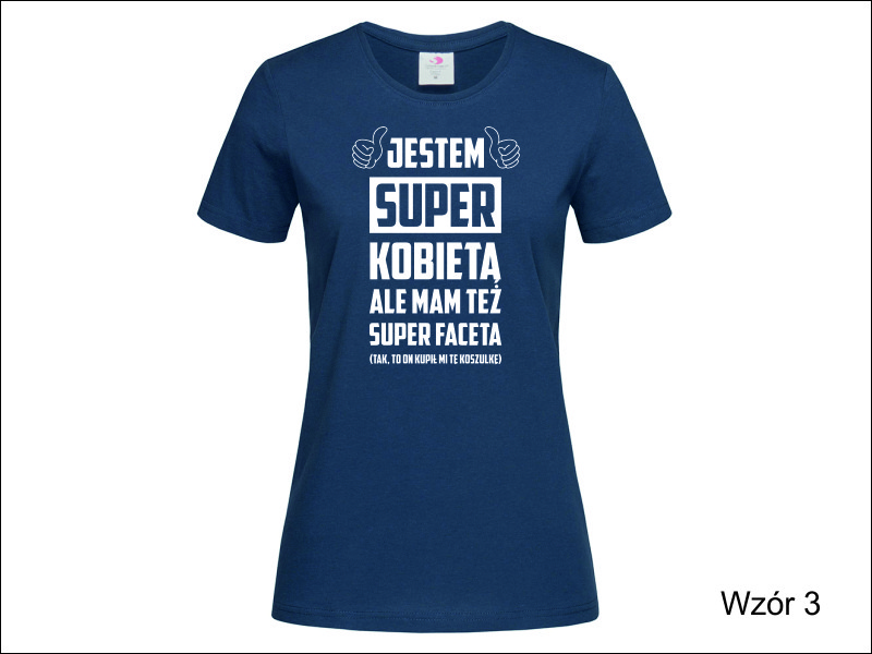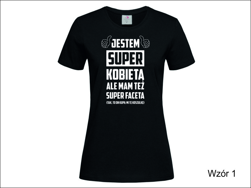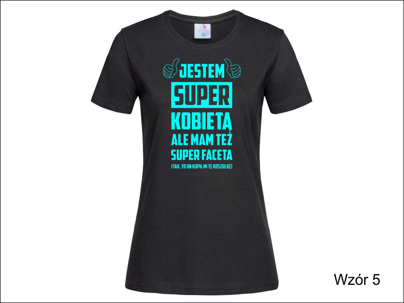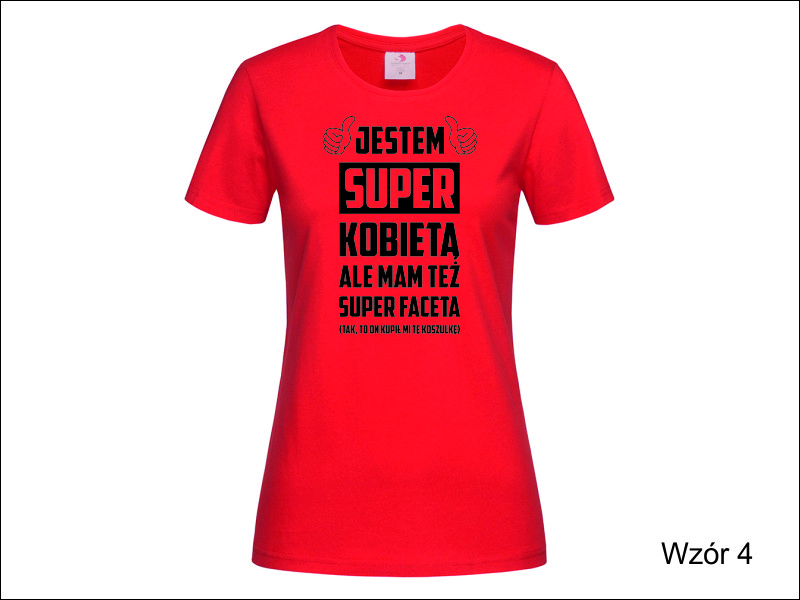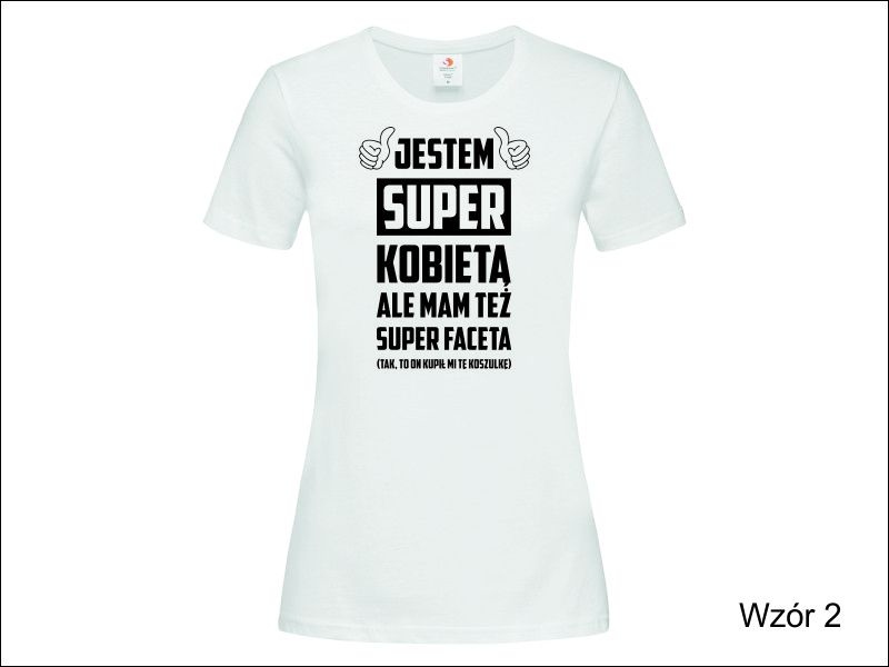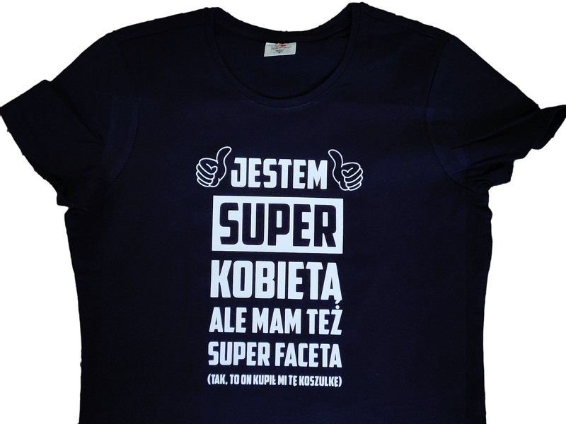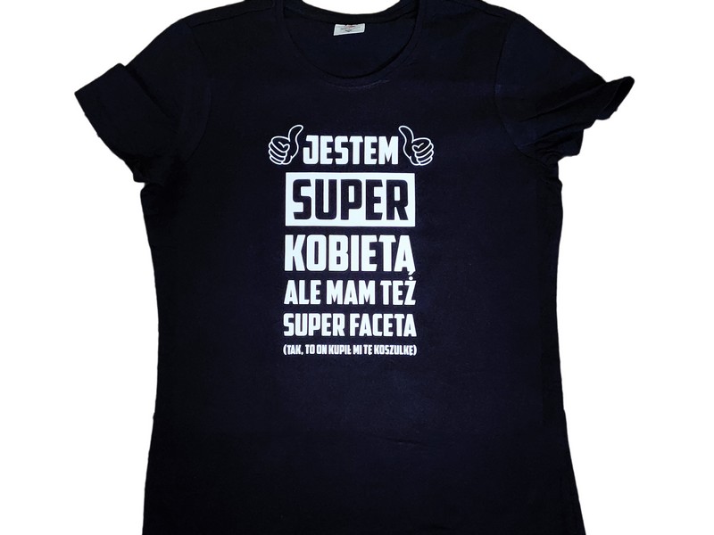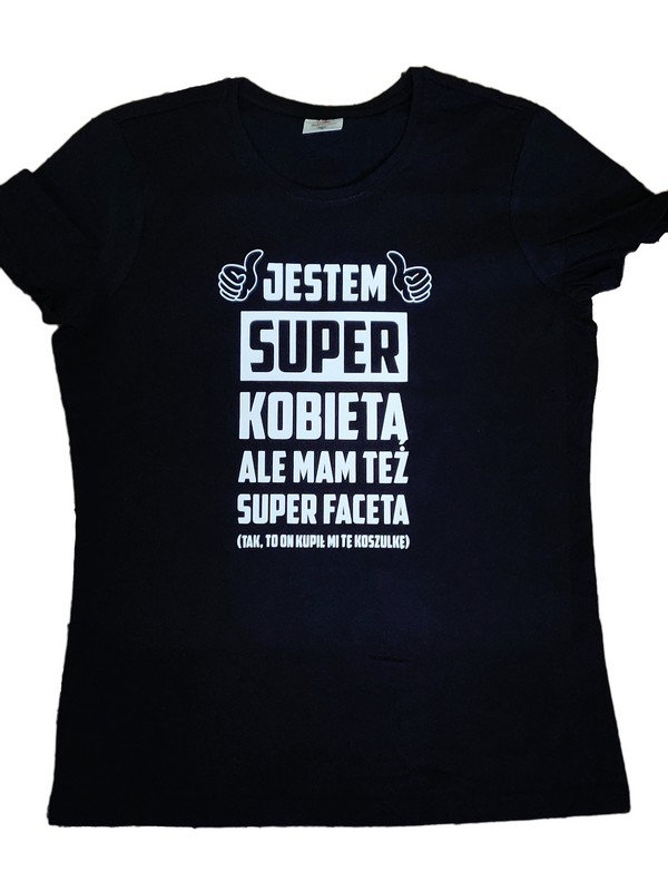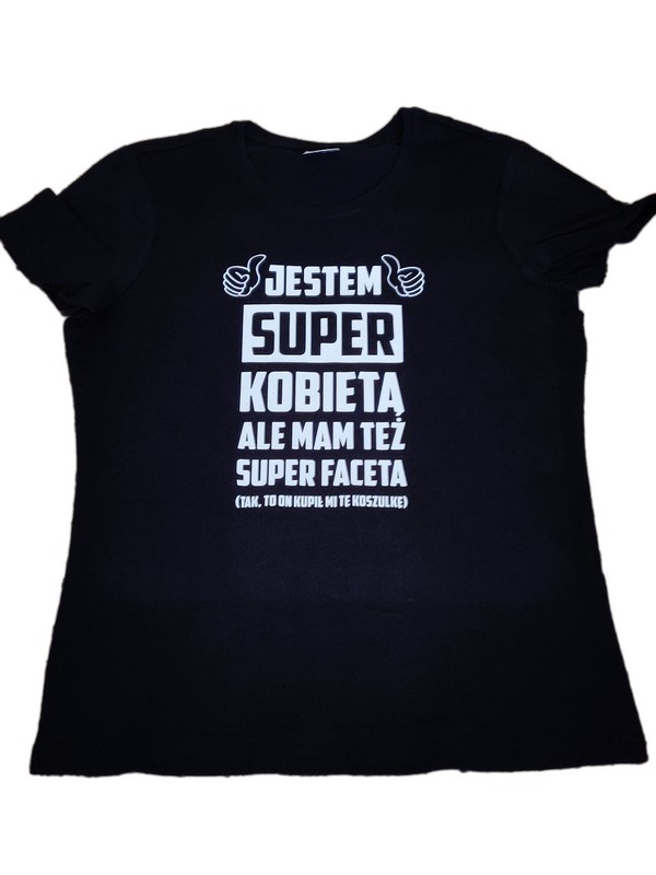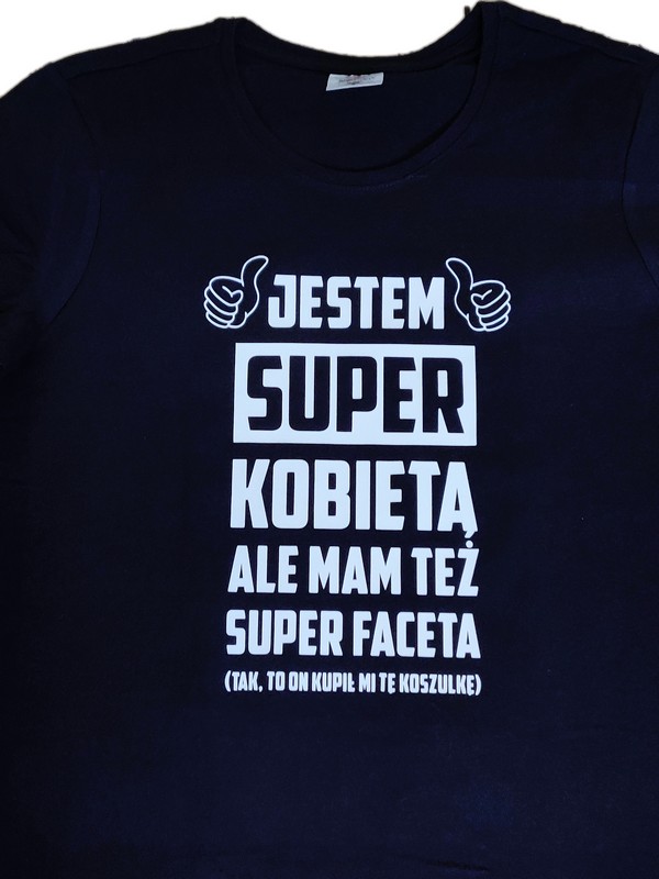 Motywem przewodnim nadruku na koszulce jest dedykacja "Jestem super kobietą i mam super faceta".