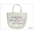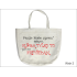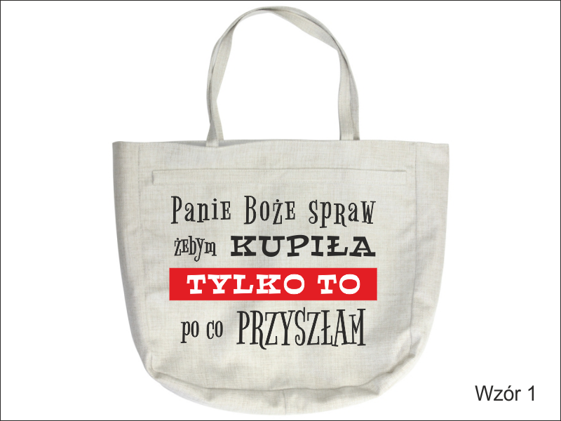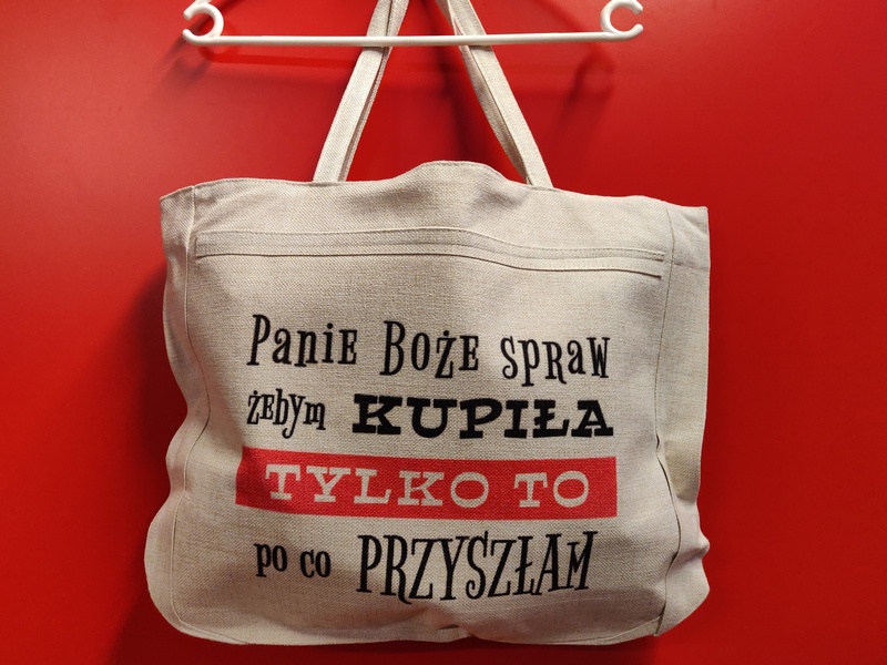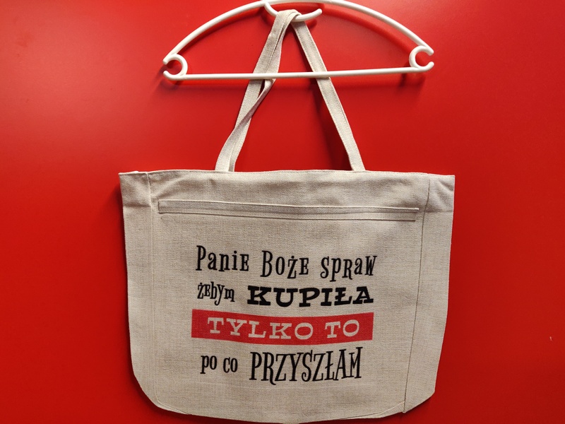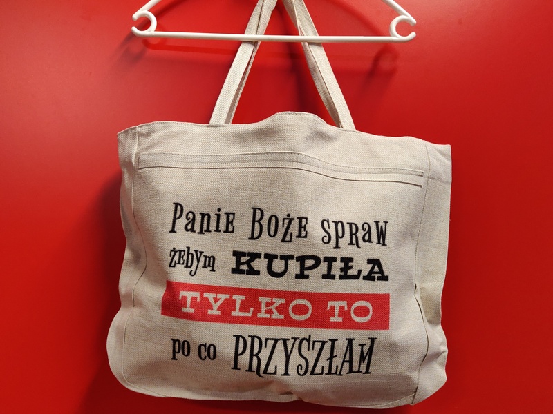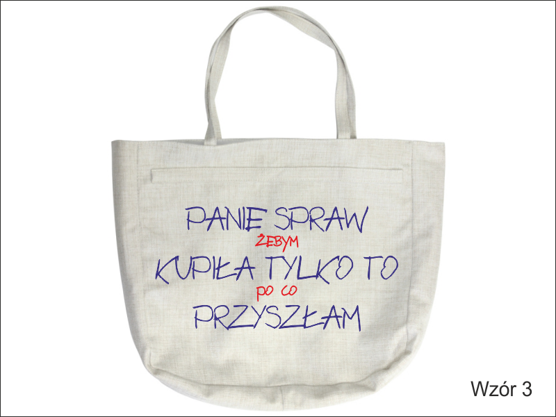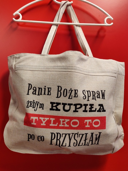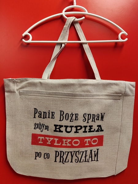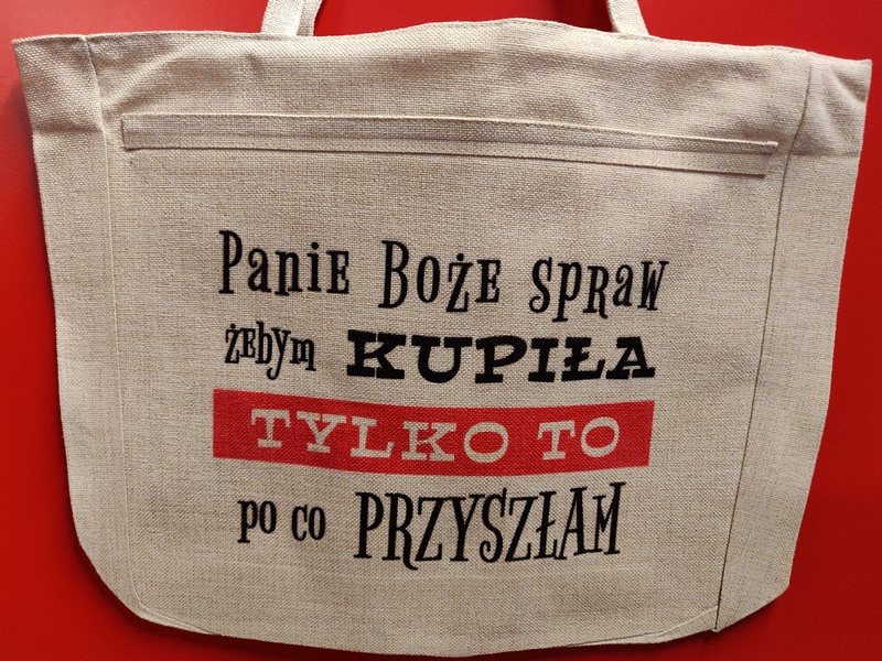 Motywem przewodnim na torbie jest dedykacja "...żebym kupiła tylko to po co przyszłam".