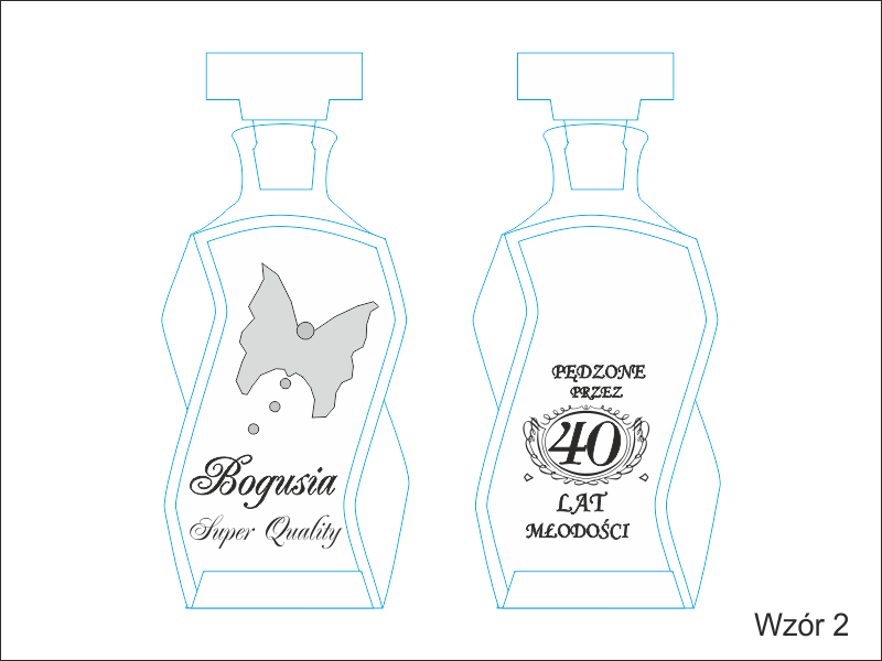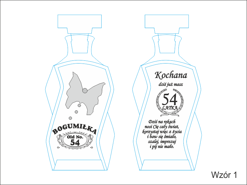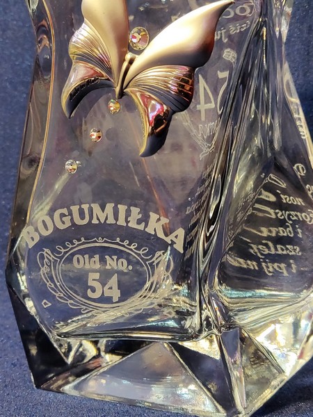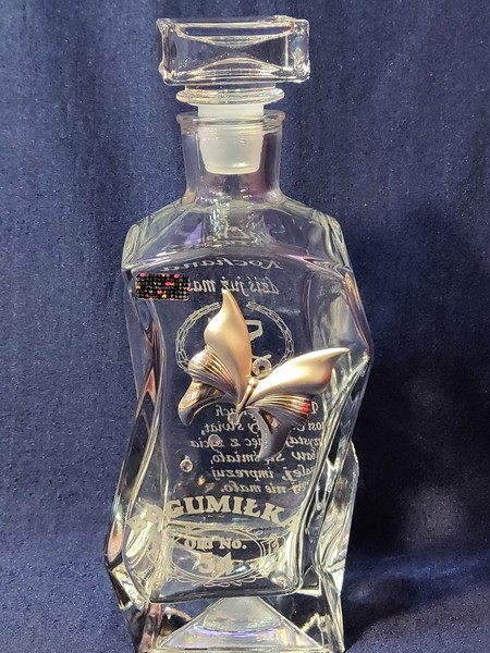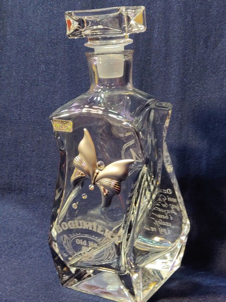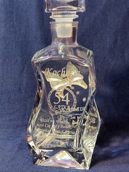 Grawer na karafce wykonany jest po obu jej stronach. Z przodu karafki pod ozdobnym motylem oraz z tyłu na odwrocie karafki.