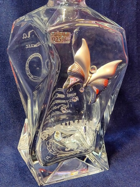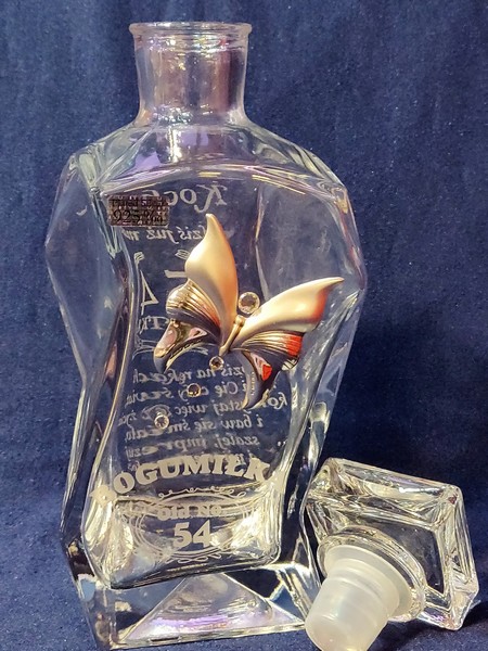 Dodatkowo karafka ozdobiona jest centralnie umieszczonym dużym srebrnym motylem z kryształkami.