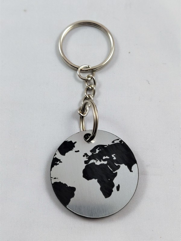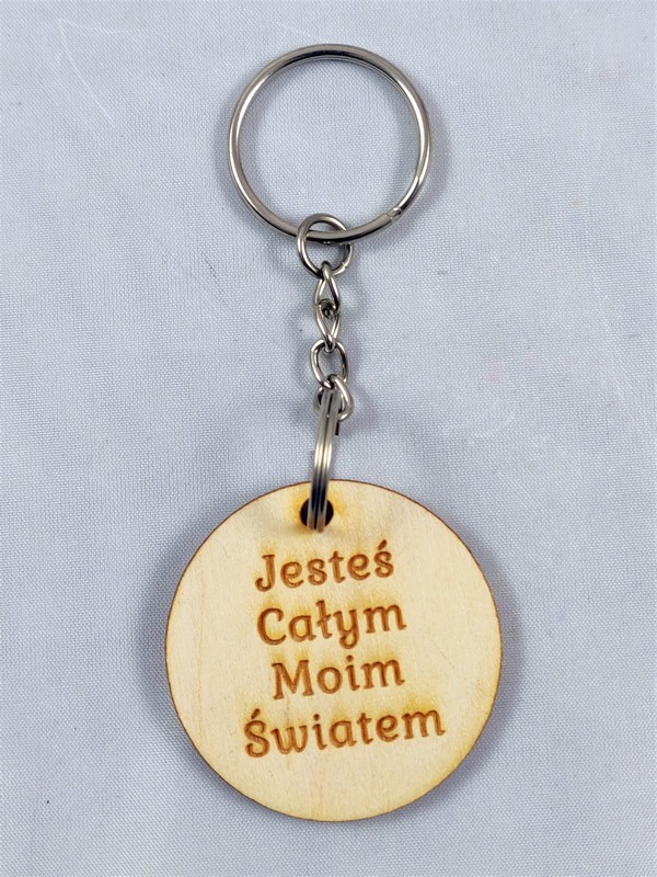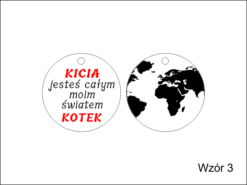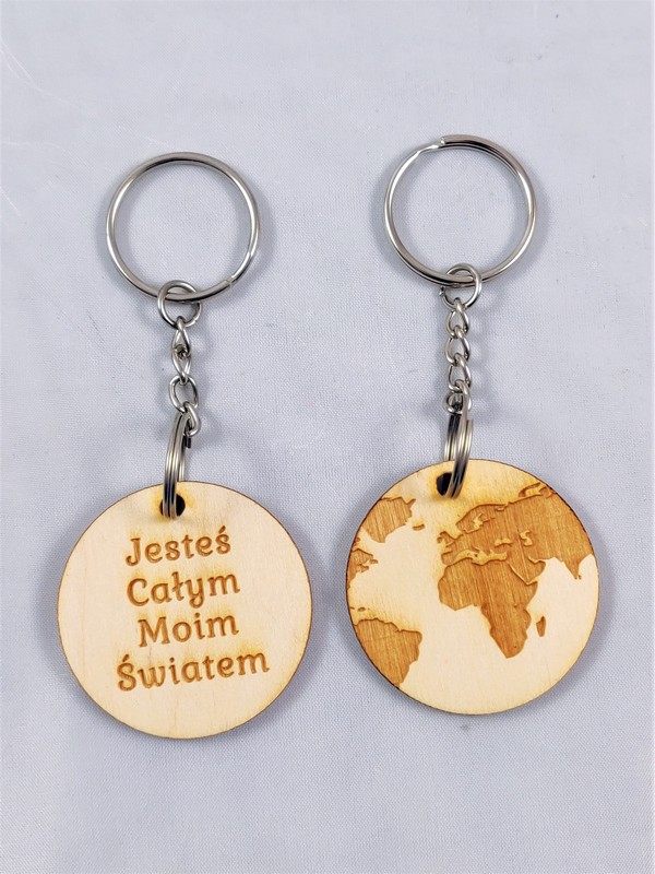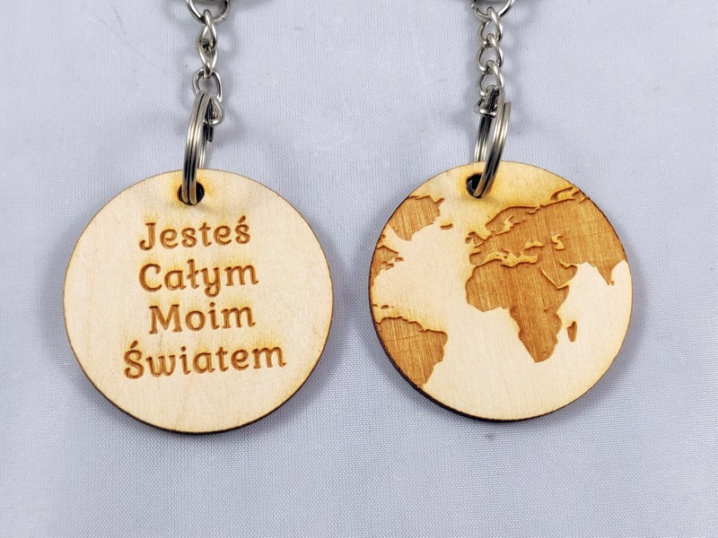 Z jednej strony breloczka wykonany jest grawer zarysu kontynentów, przedstawiający kulę ziemską, a z drugiej strony wykonany jest grawer dedykacji "Jesteś całym moim światem".