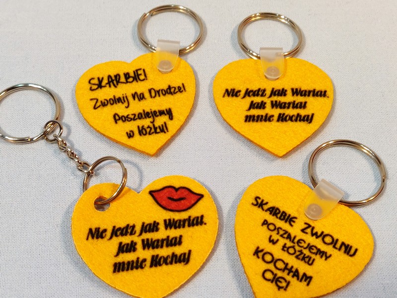 Brelok ma kształt wyciętego z filcu serca, na którym wykonany jest nadruk dedykacji.