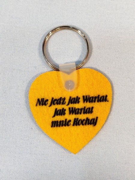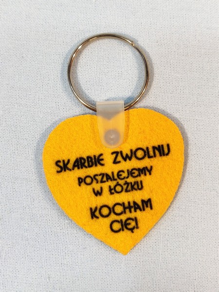 Upominek dla zakochanych w formie breloczka z żółtego filcu w kształcie serca z nadrukiem dedykacji.
