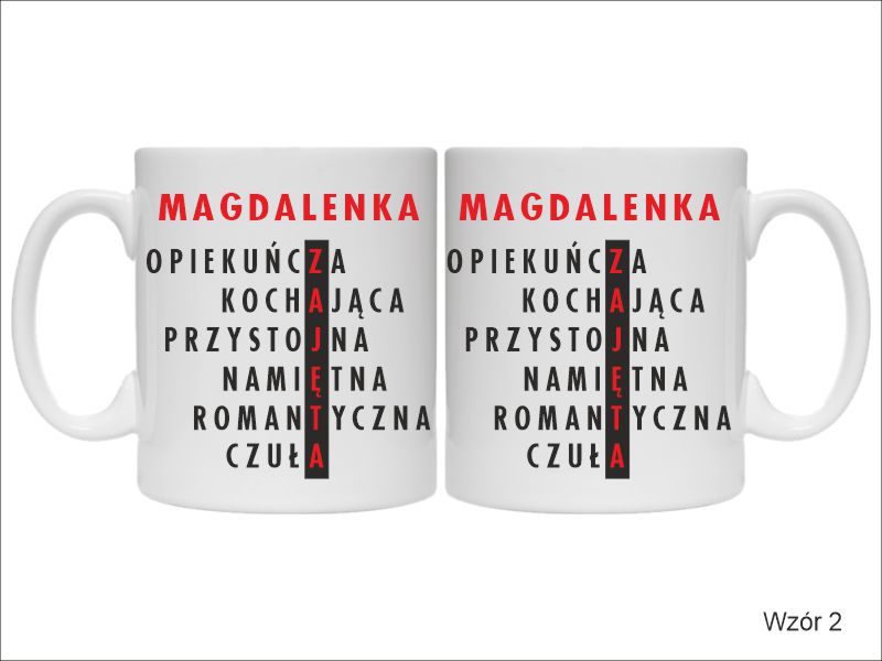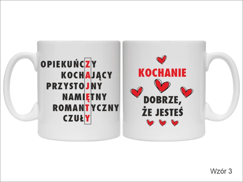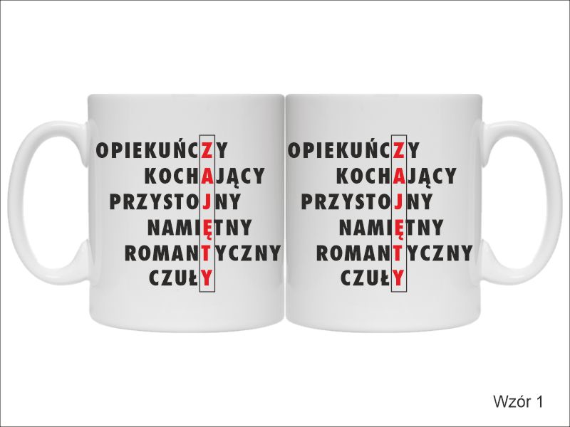 Nadruk dedykacji na kubku jest dowolny i można wykorzystać jeden z wzorów lub wykonać wg indywidualnych ustaleń.