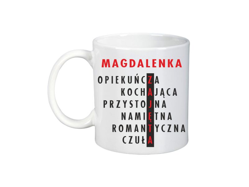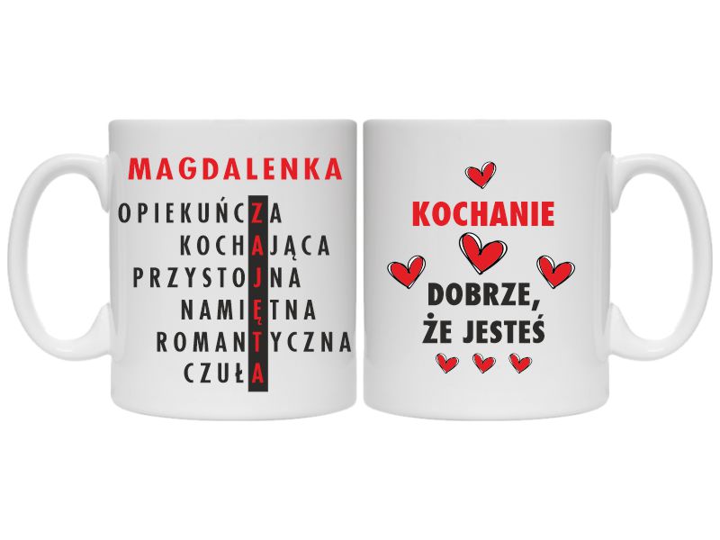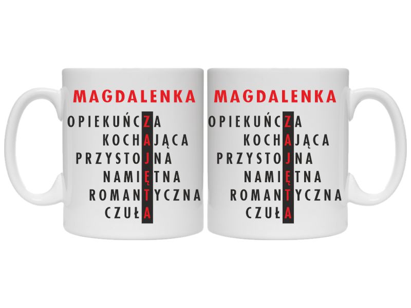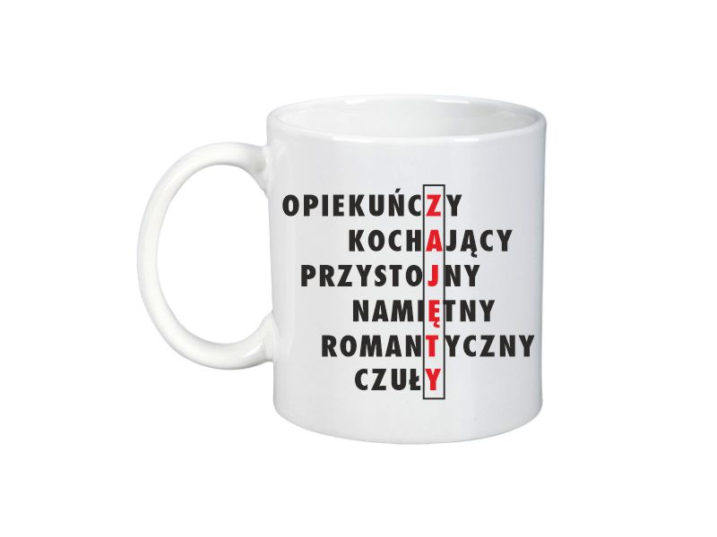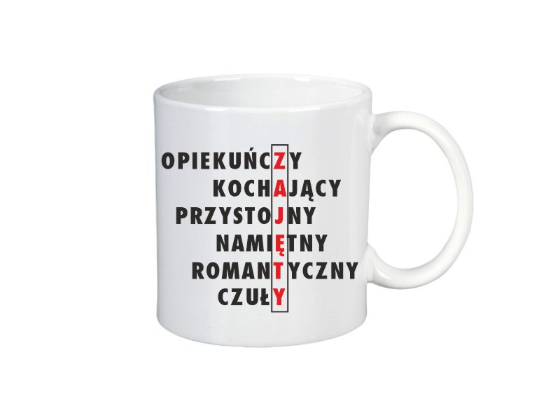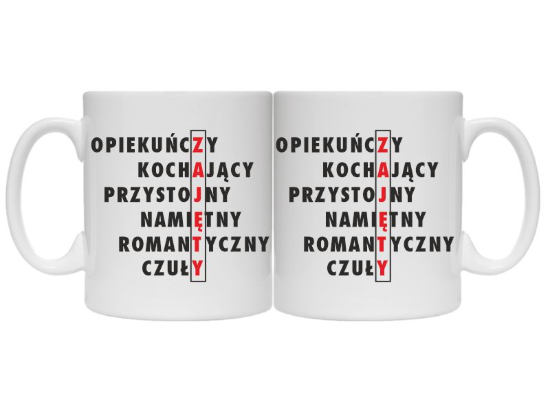 W projekcie nadruku na kubku wykorzystano motyw krzyżówki, której rozwiązaniem jest hasło, że ukochana osoba jest już "zajęta".