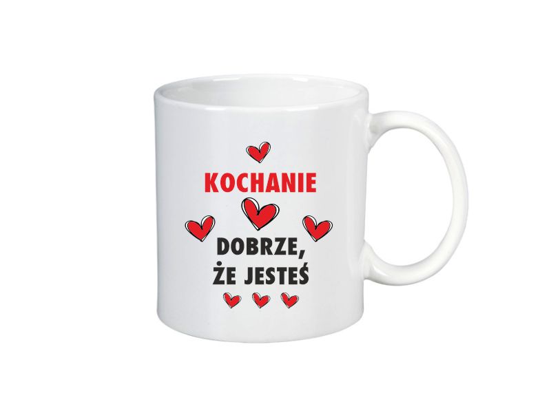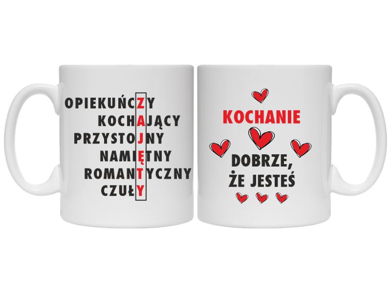 Propozycja na upominek dla zakochanych w postaci białego kubeczka z nadrukiem.
