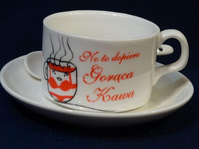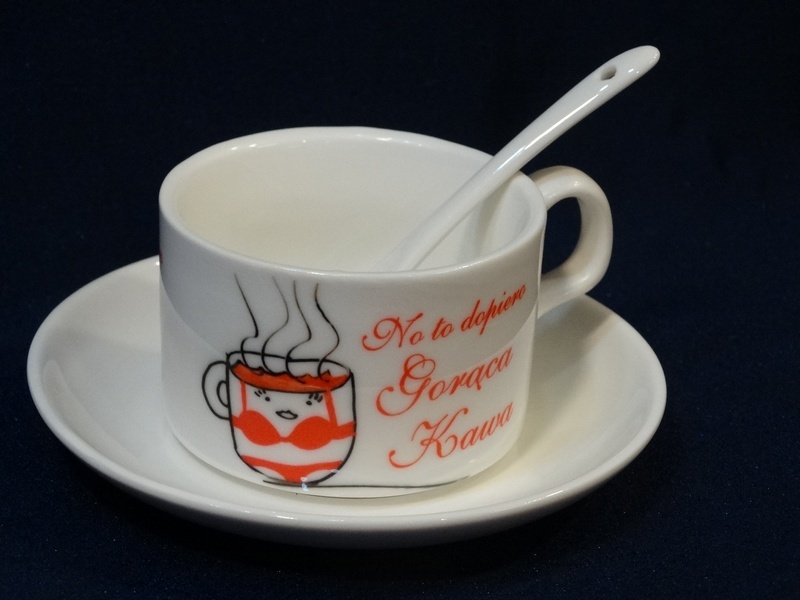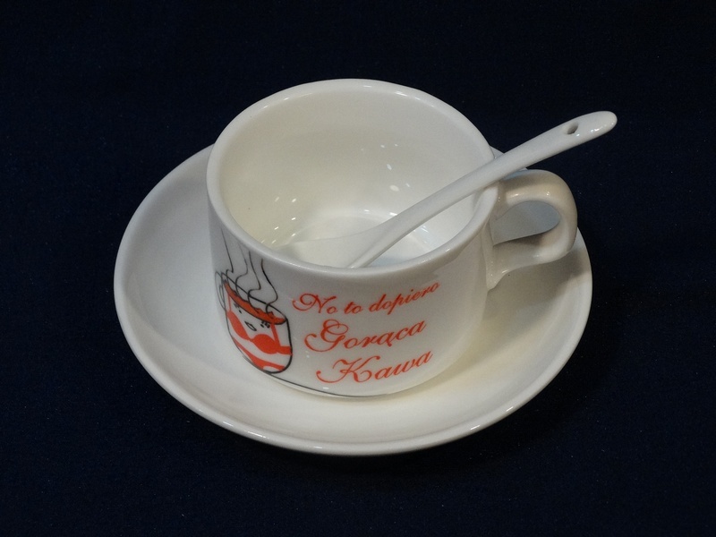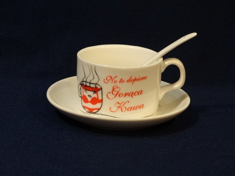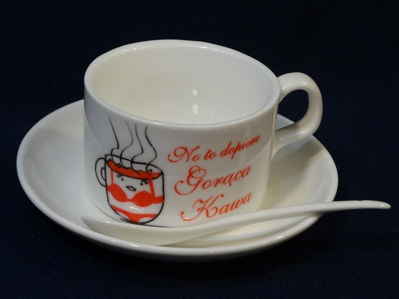 Propozycja na upominek dla Niej lub dla Niego w postaci białej filiżanki ze spodkiem i łyżeczką, z nadrukiem.