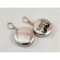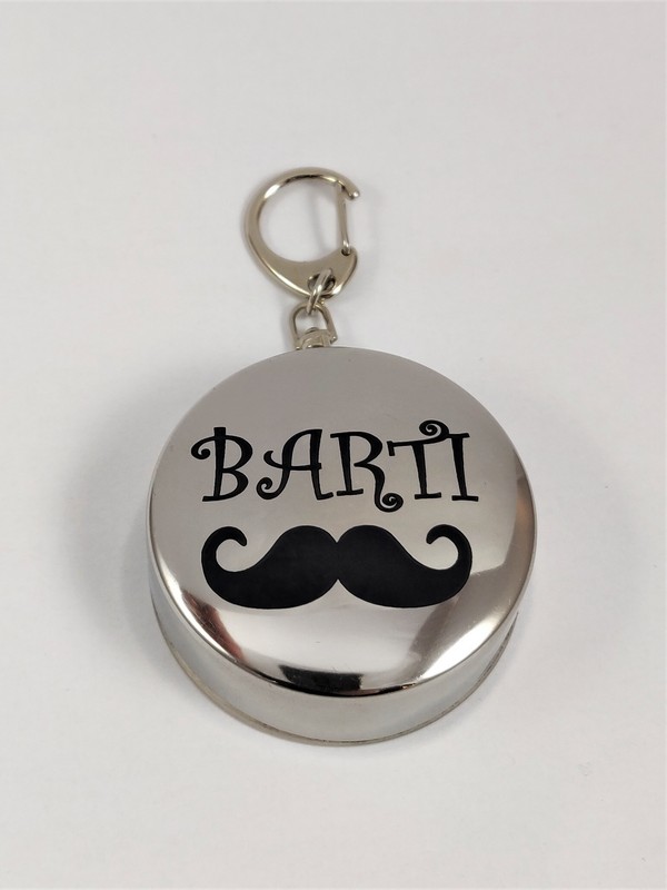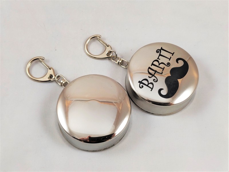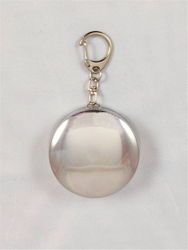 Brelok ma formę metalowej, wykonanej z polerowanej stali nierdzewnej, okrągłej, zamkniętej kasety.