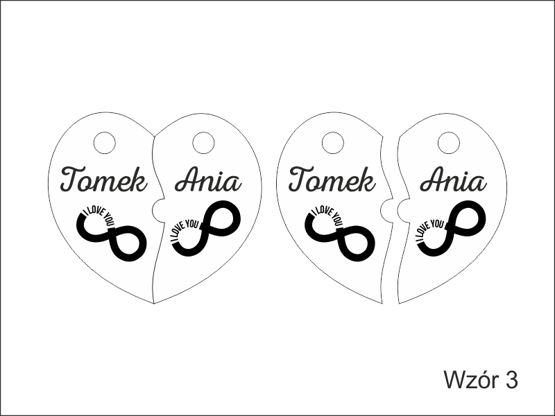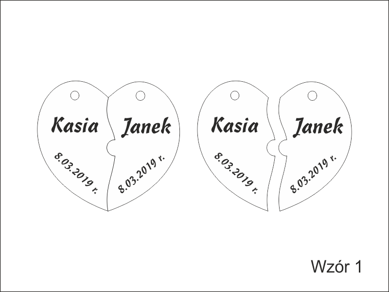 Breloczki wykonane są ze sklejki grubości 3 lub 5 mm, wyciętej w kształcie pasujących do siebie połówek serca.