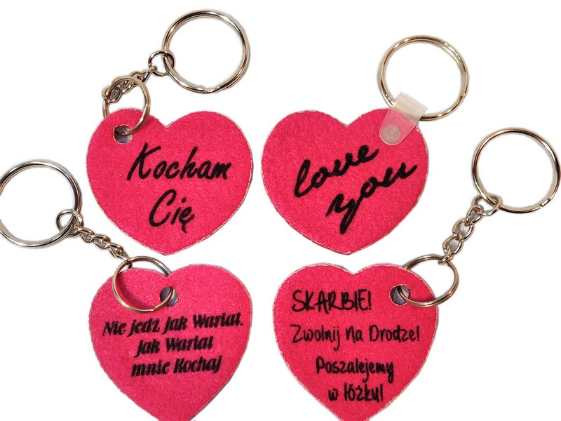 Upominek dla zakochanych w postaci breloczka z czerwonego filcu w kształcie serca z nadrukiem dedykacji.