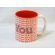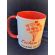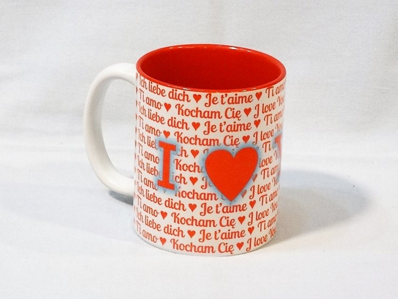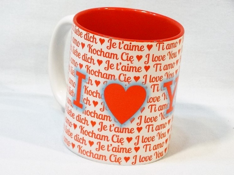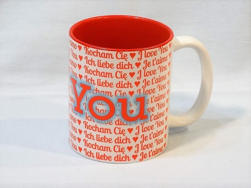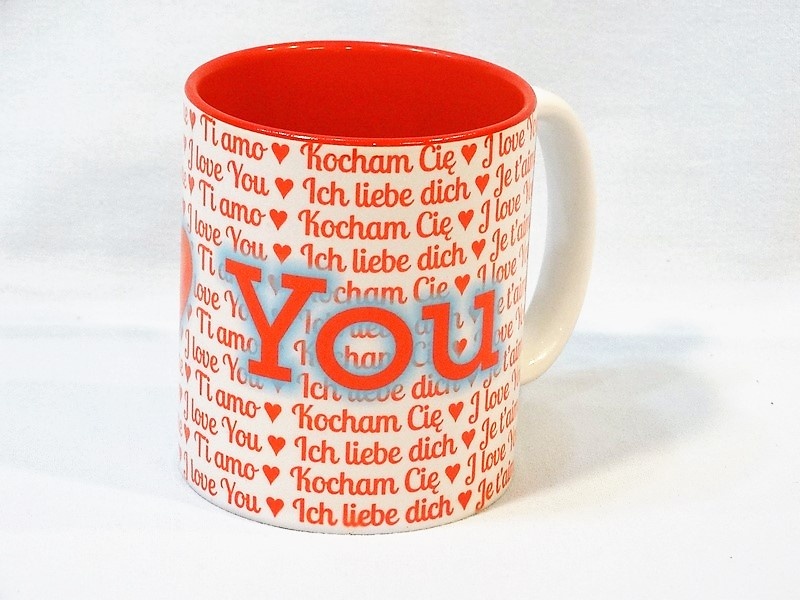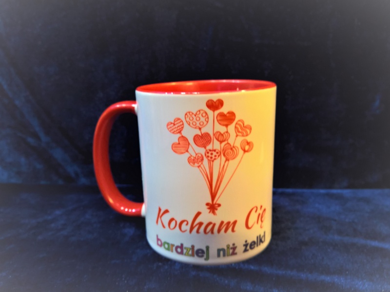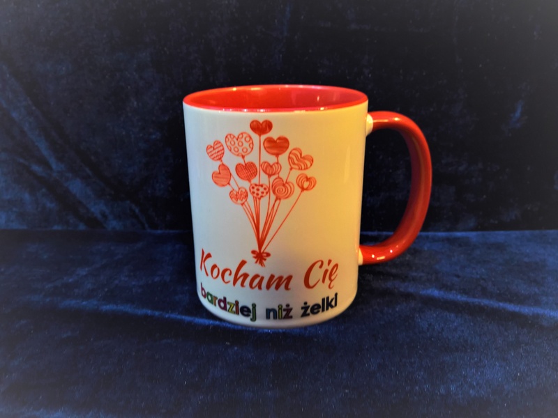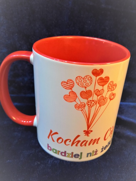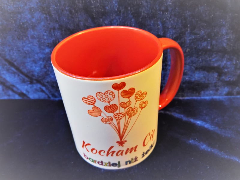 Propozycja na upominek dla Zakochanych w postaci białego kubka z czerwonym wnętrzem, z nadrukiem.