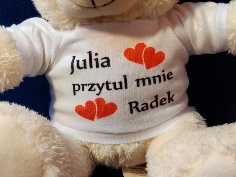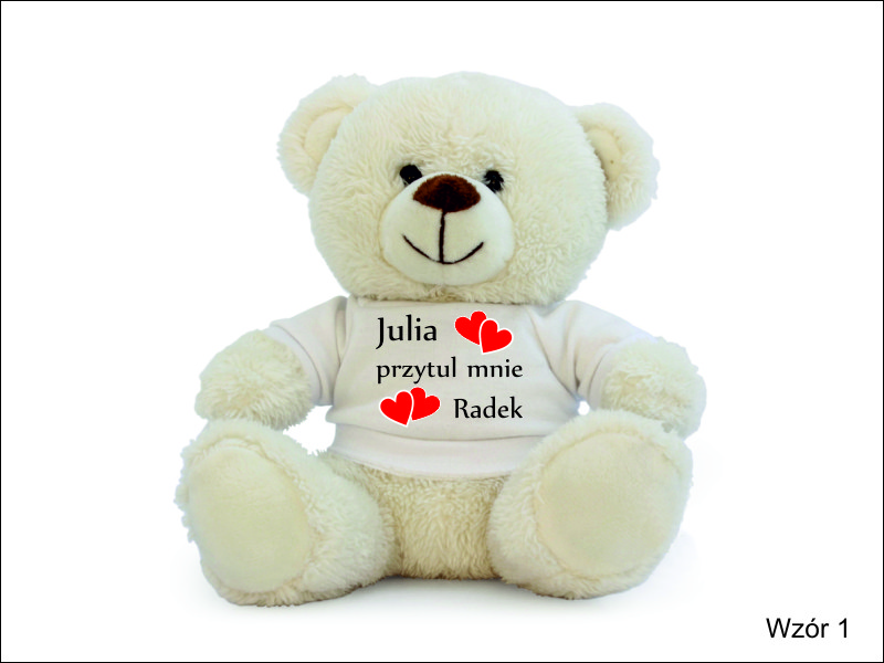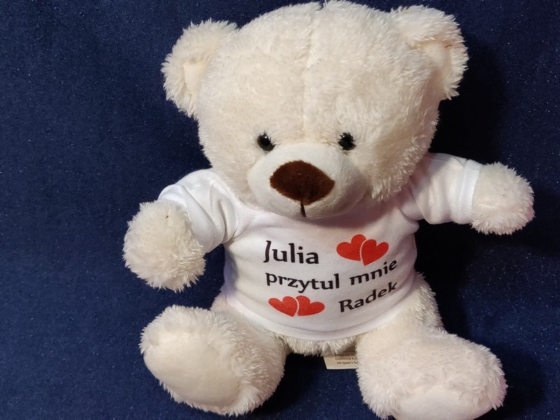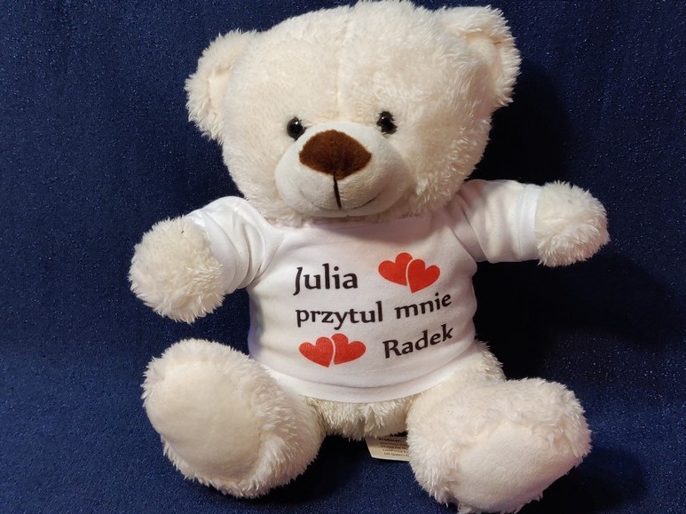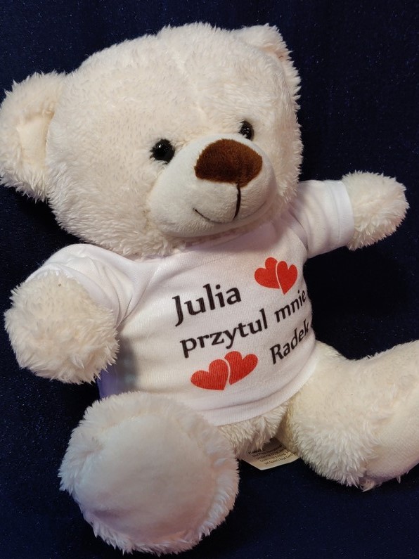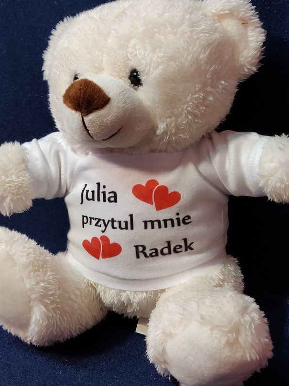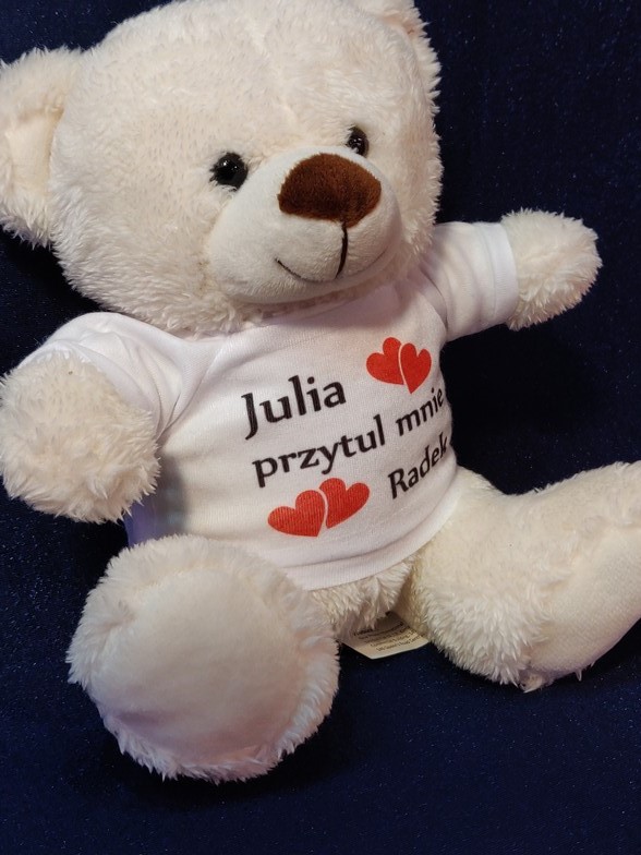Maskotka jako upominek dla Zakochanych w formie misia z nadrukiem dedykacji.