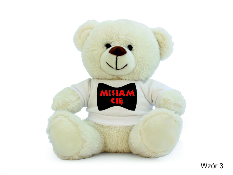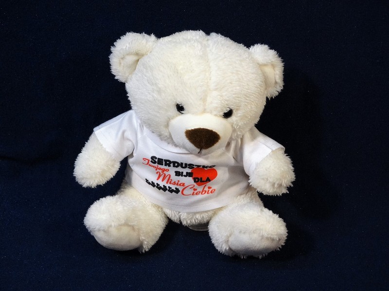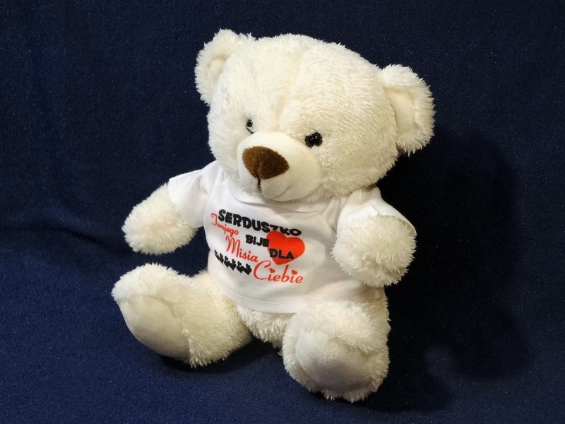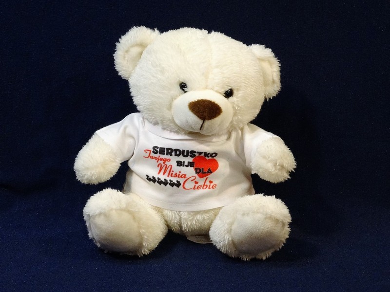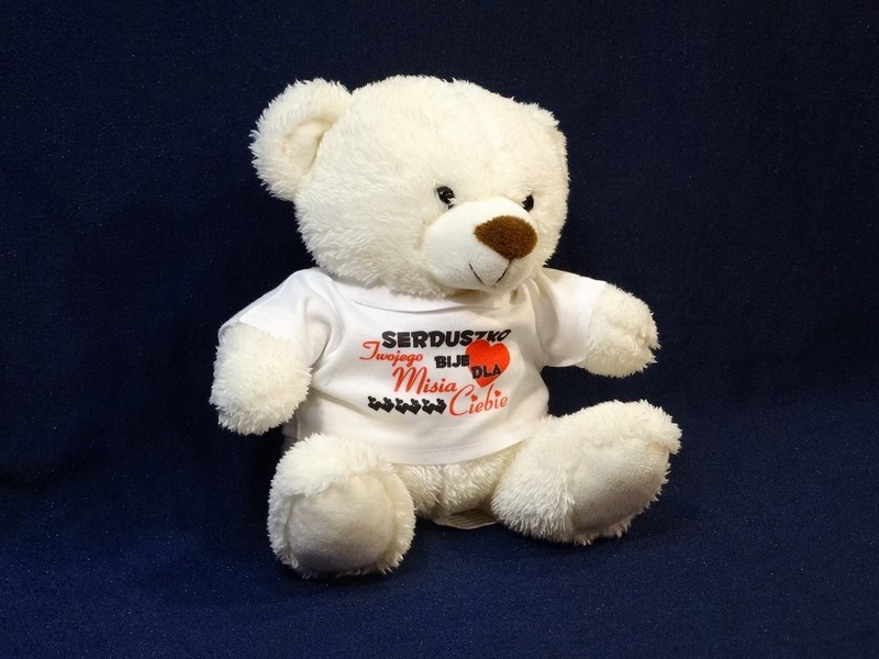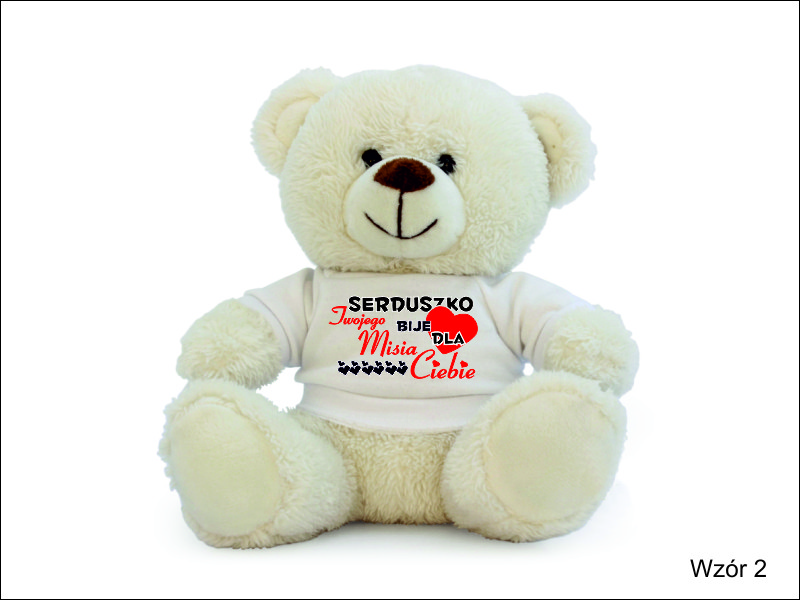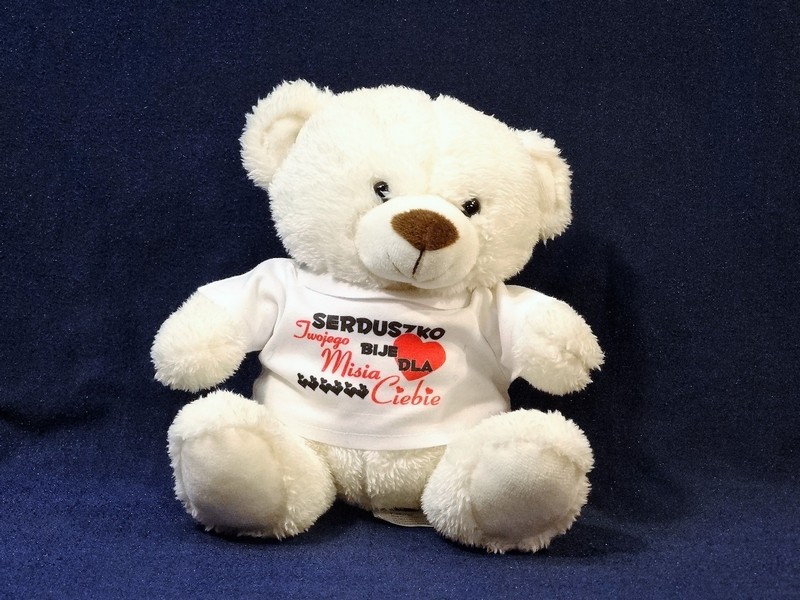 Na koszulce, w którą ubrany jest miś wykonany jest nadruk okolicznościowej dedykacji dla zakochanych.