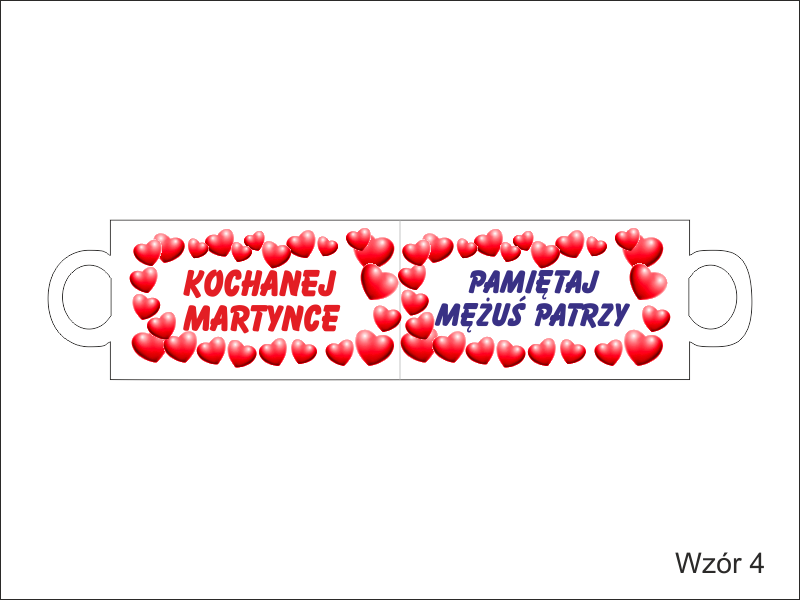 Nadruk dedykacji na filiżance jest dowolny i można wykorzystać jeden z wzorów lub wykonać wg indywidualnych ustaleń.