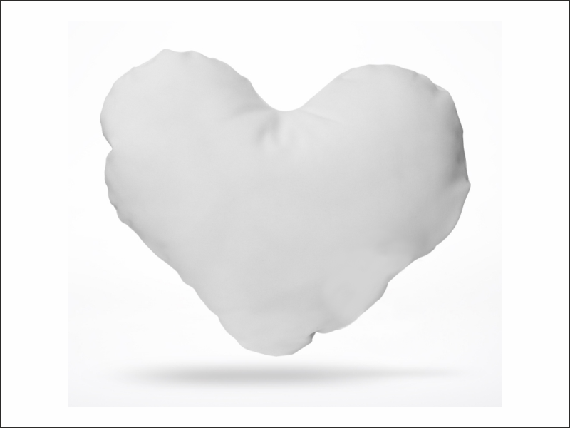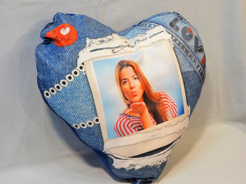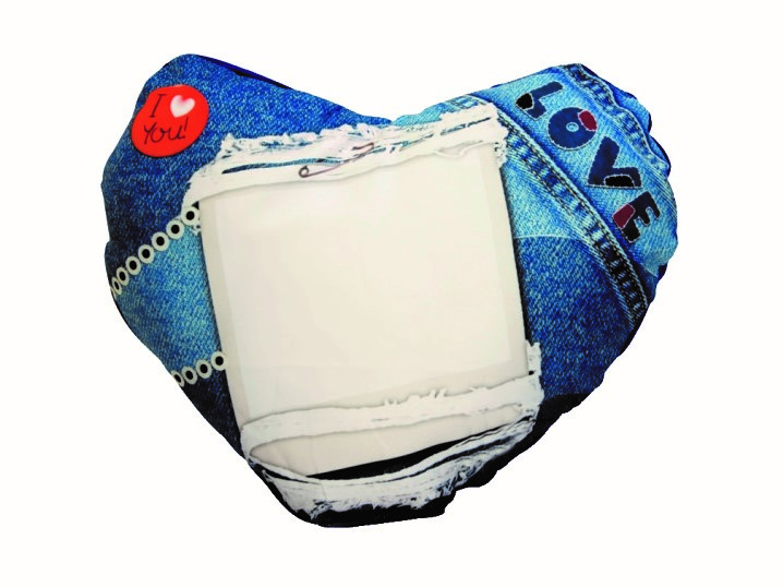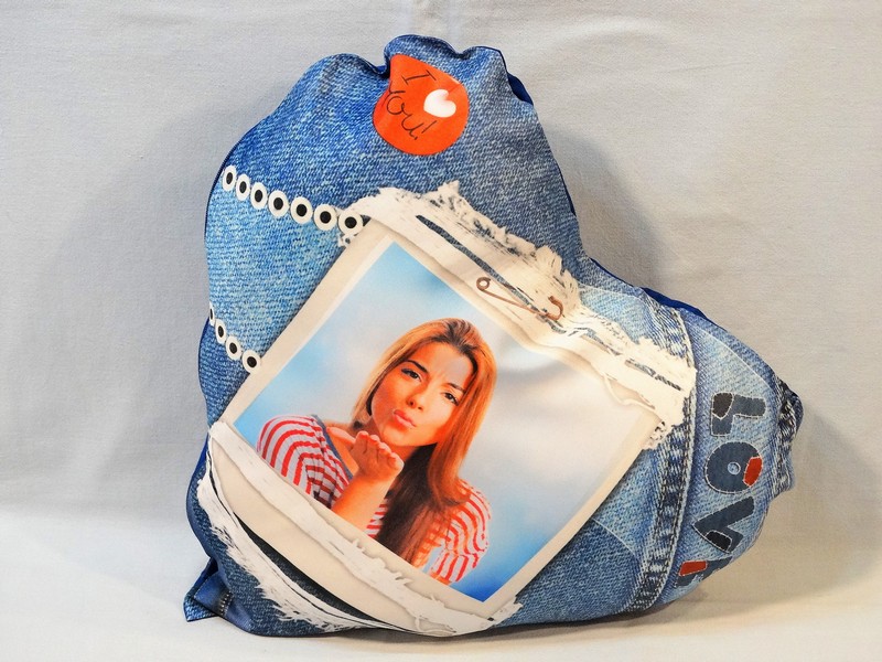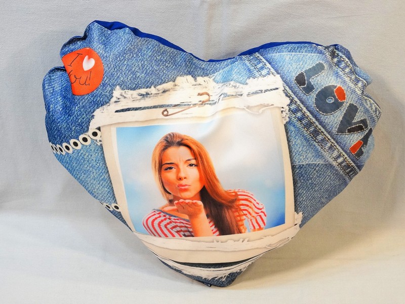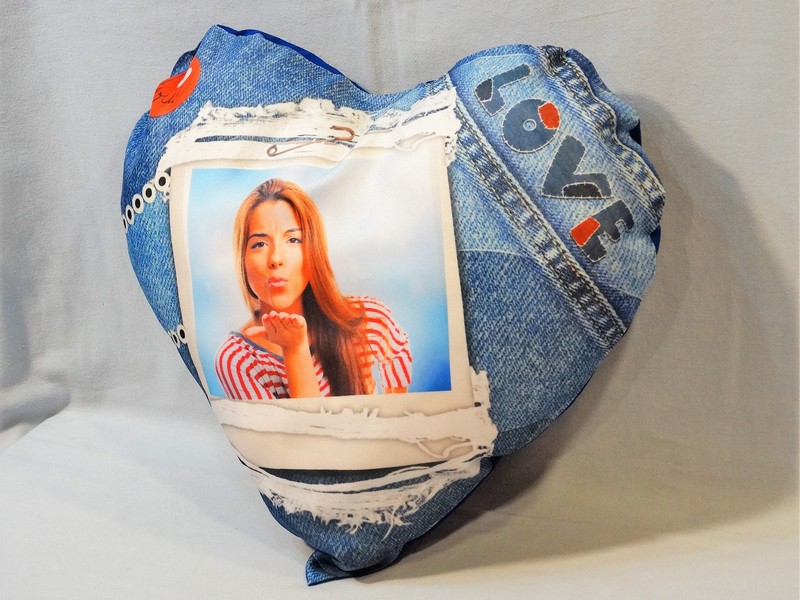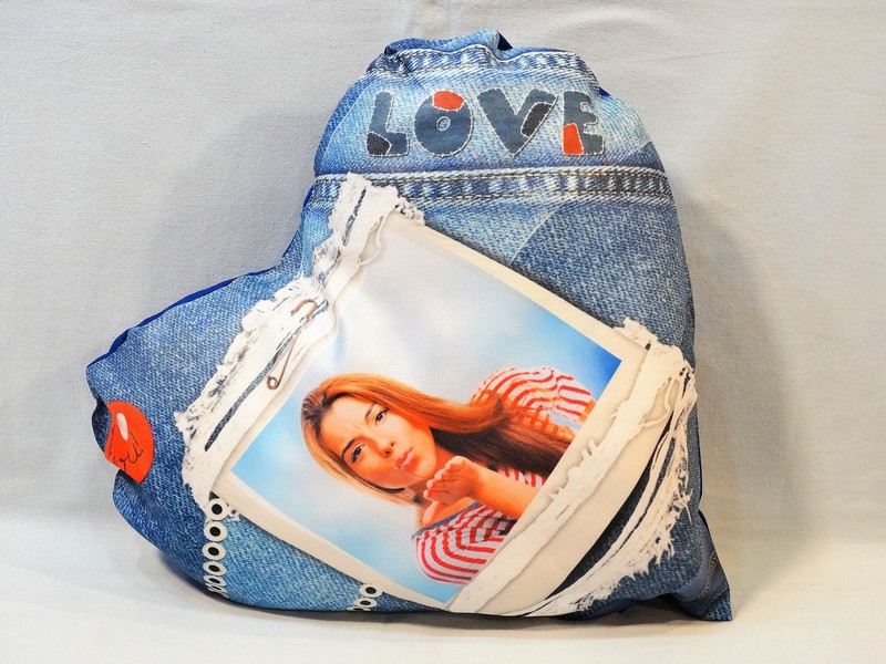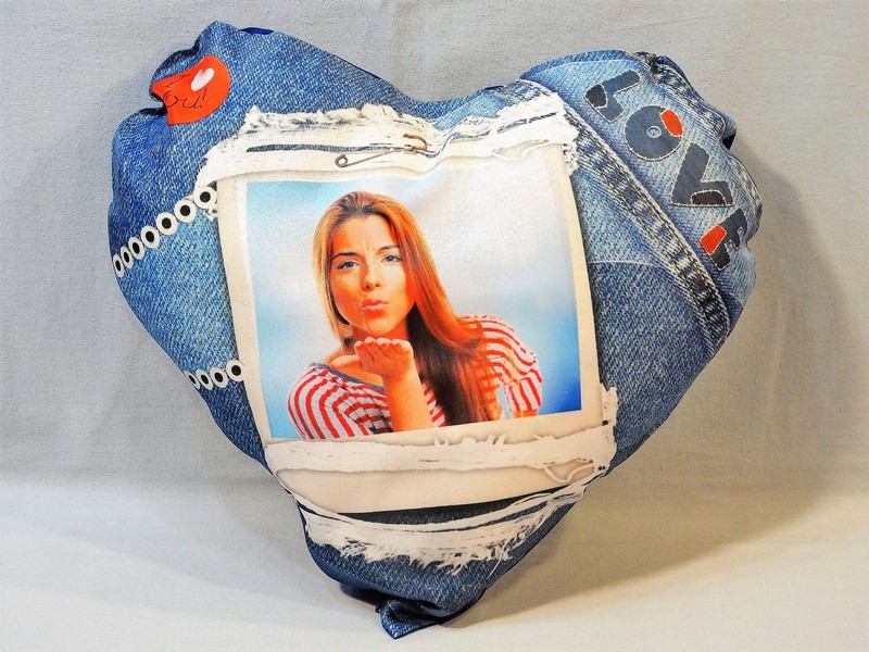Propozycja na upominek dla zakochanych w postaci poszewki w kształcie serca z polem do nadruku.